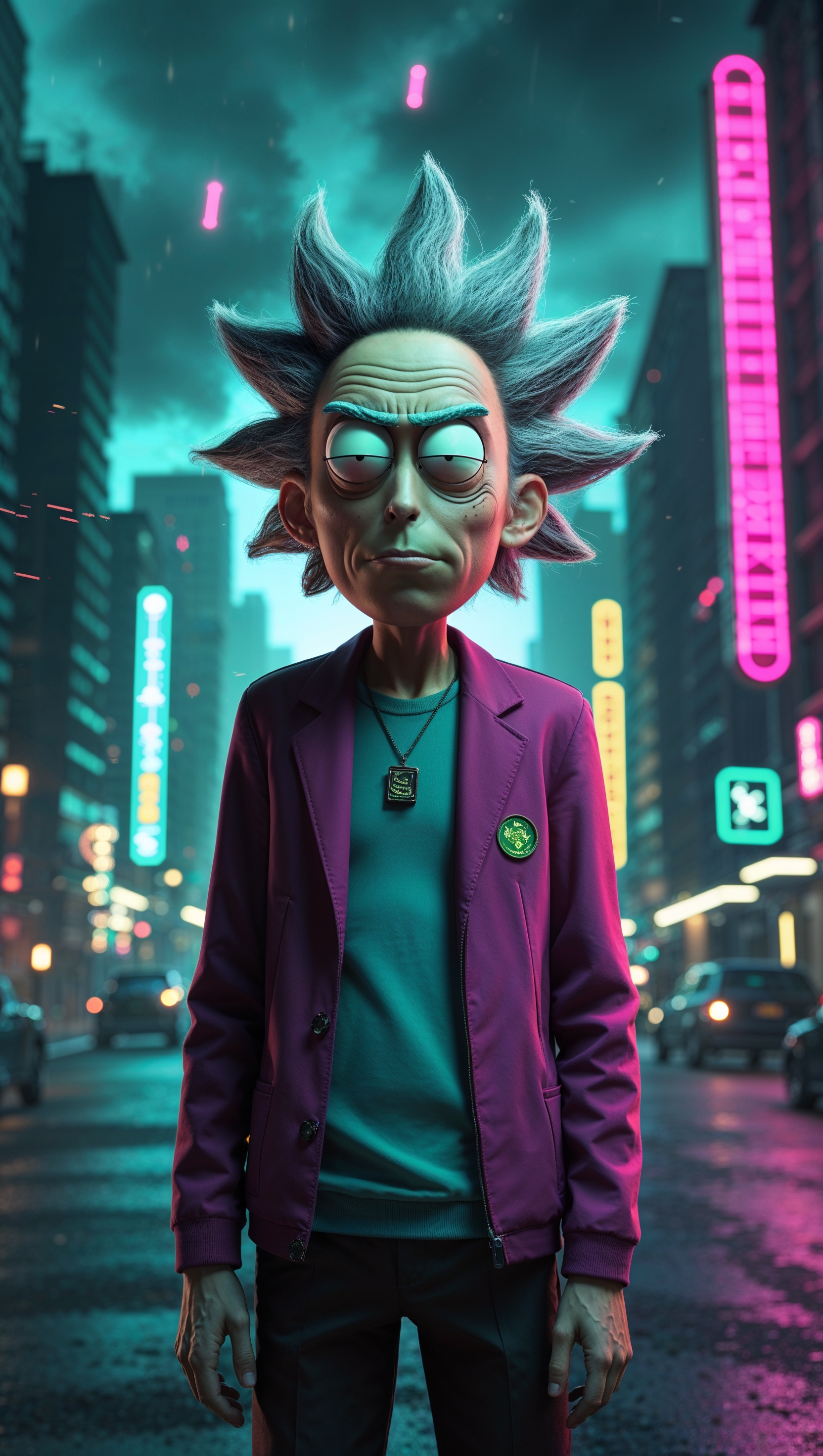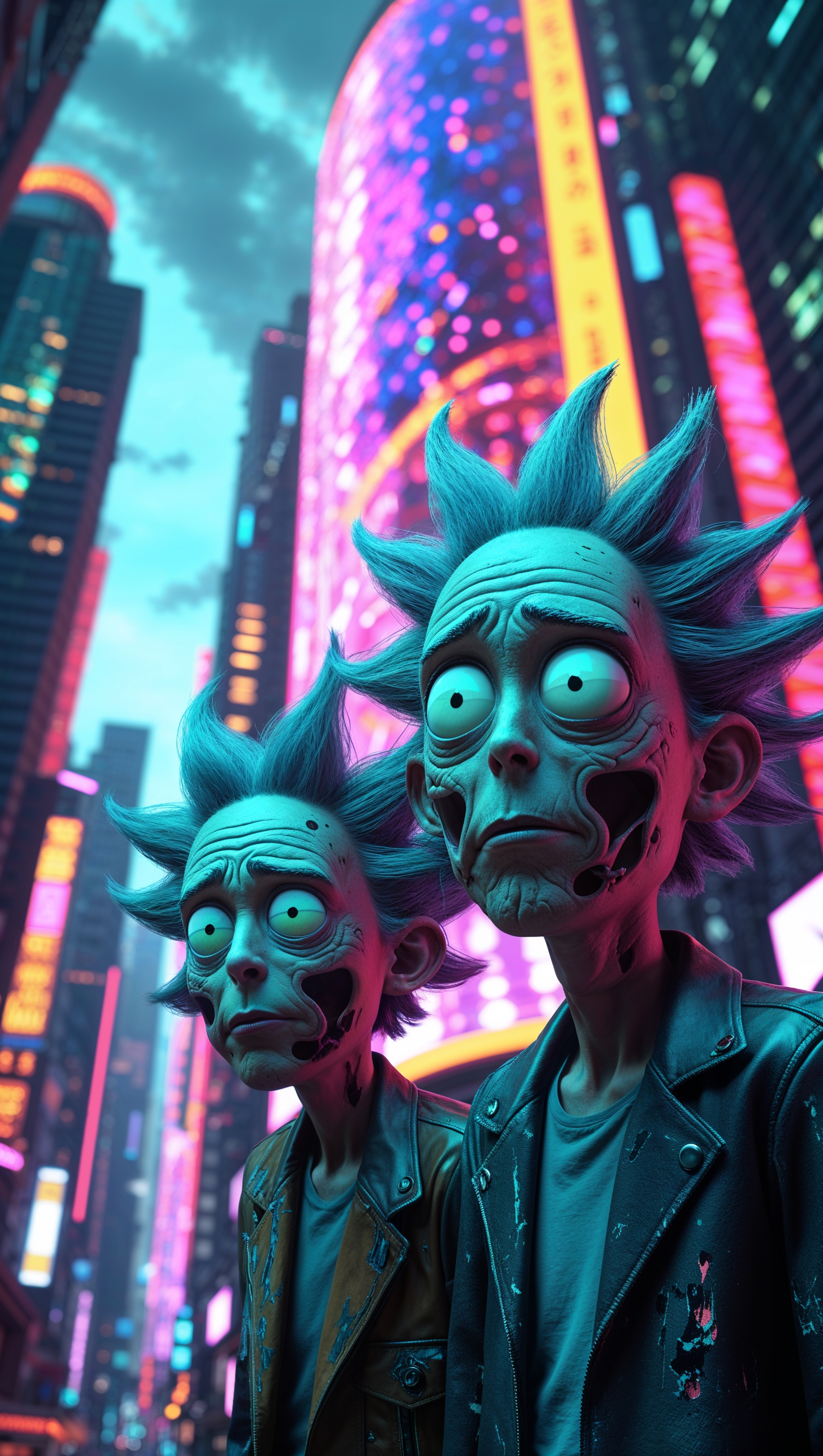 1664x2944 Rick and Morty wallpaper in a cyberpunk world, 4K quality