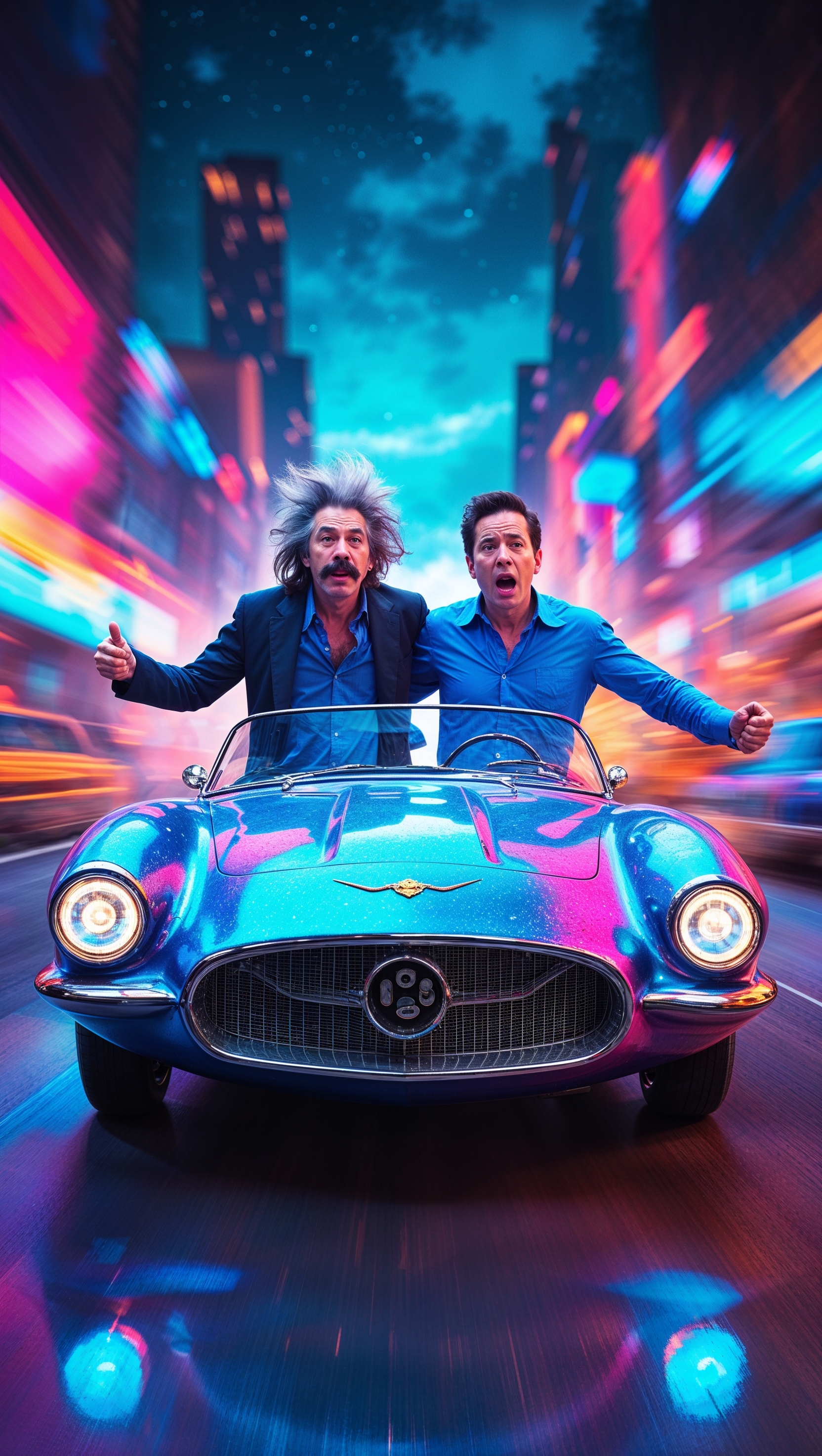 1664x2944 Rick and Morty with their flying car in a neon-lit night