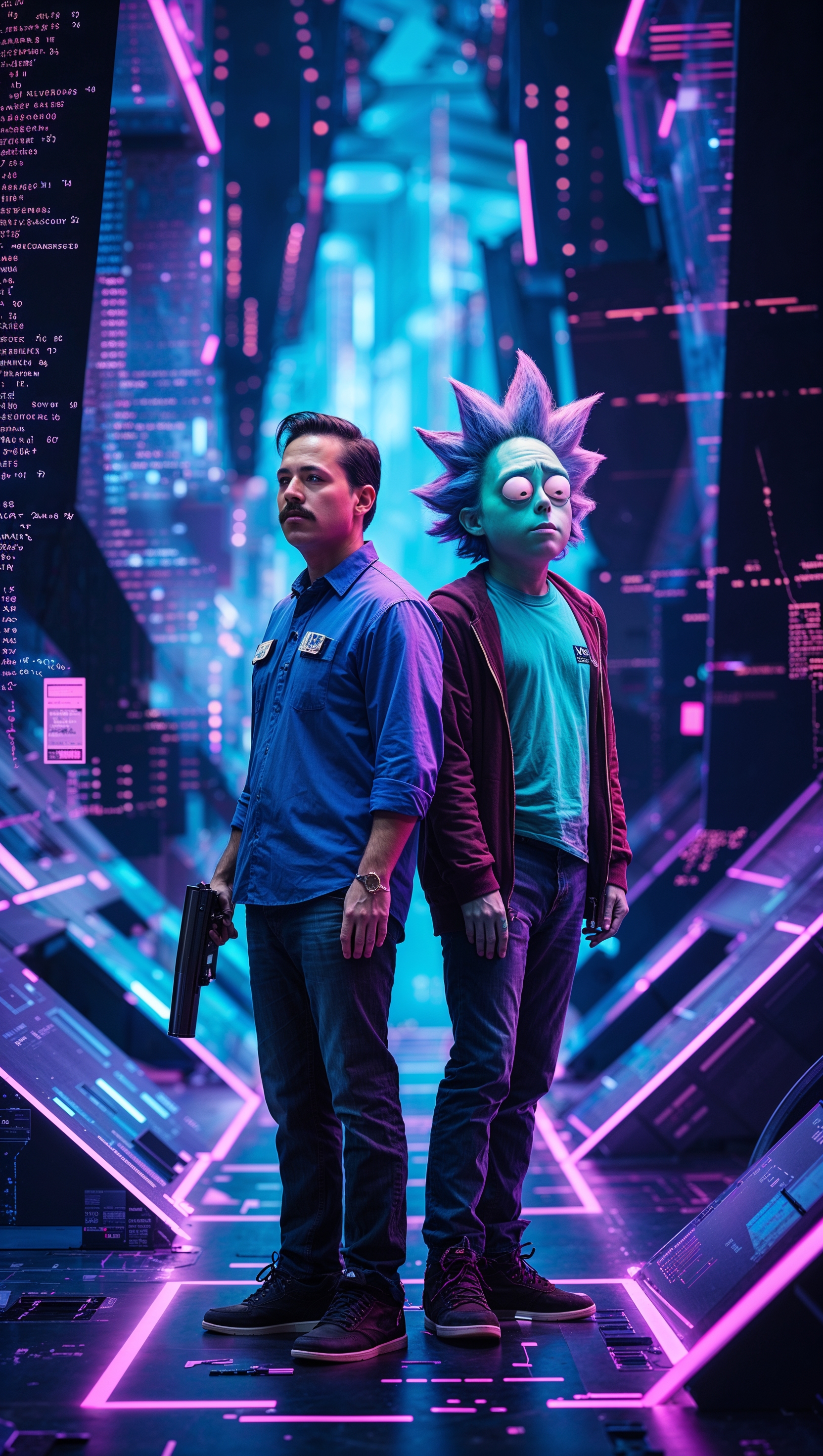 1664x2944 Rick and Morty in a digital and matrix-like world, 4K wallpaper