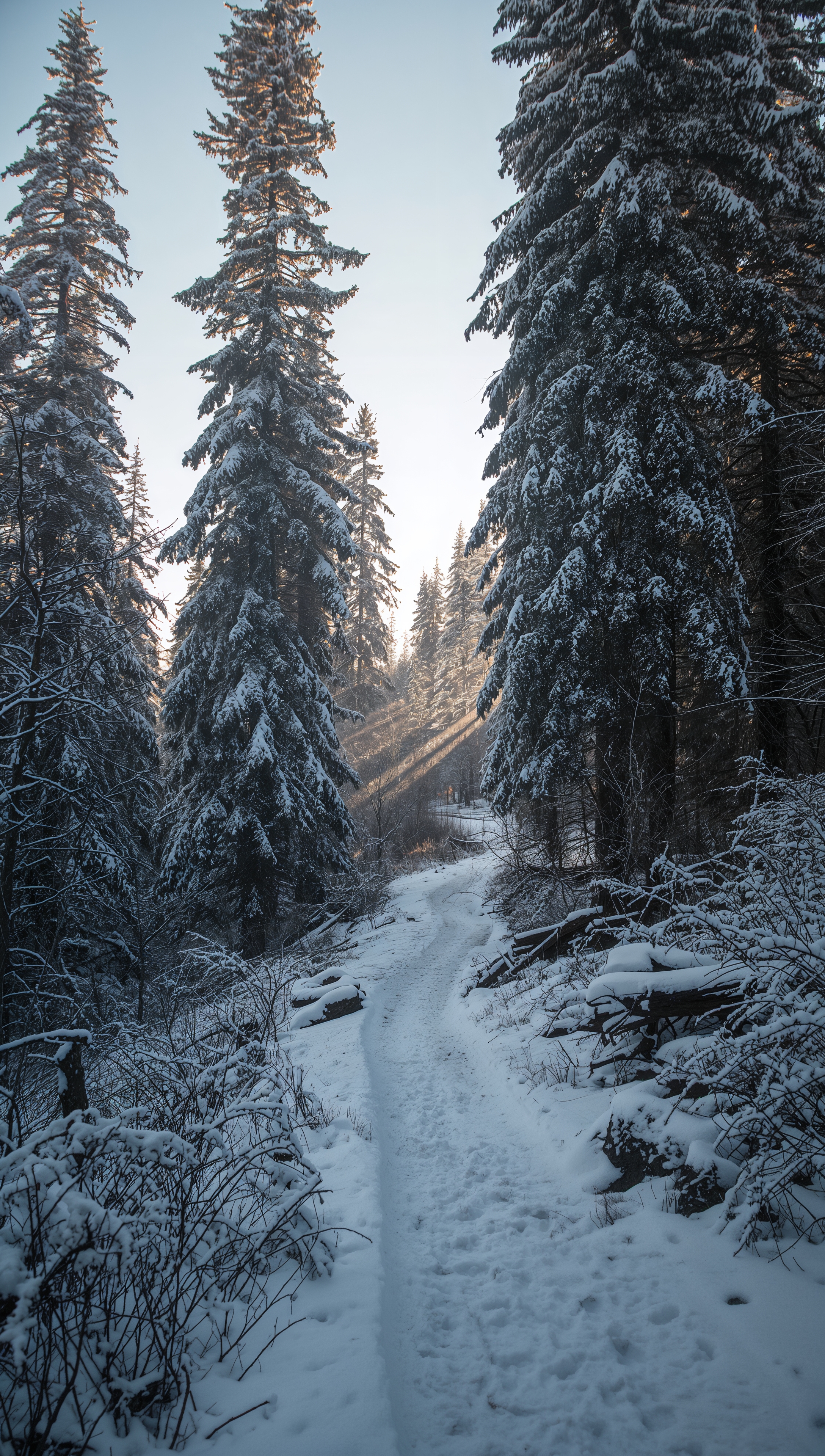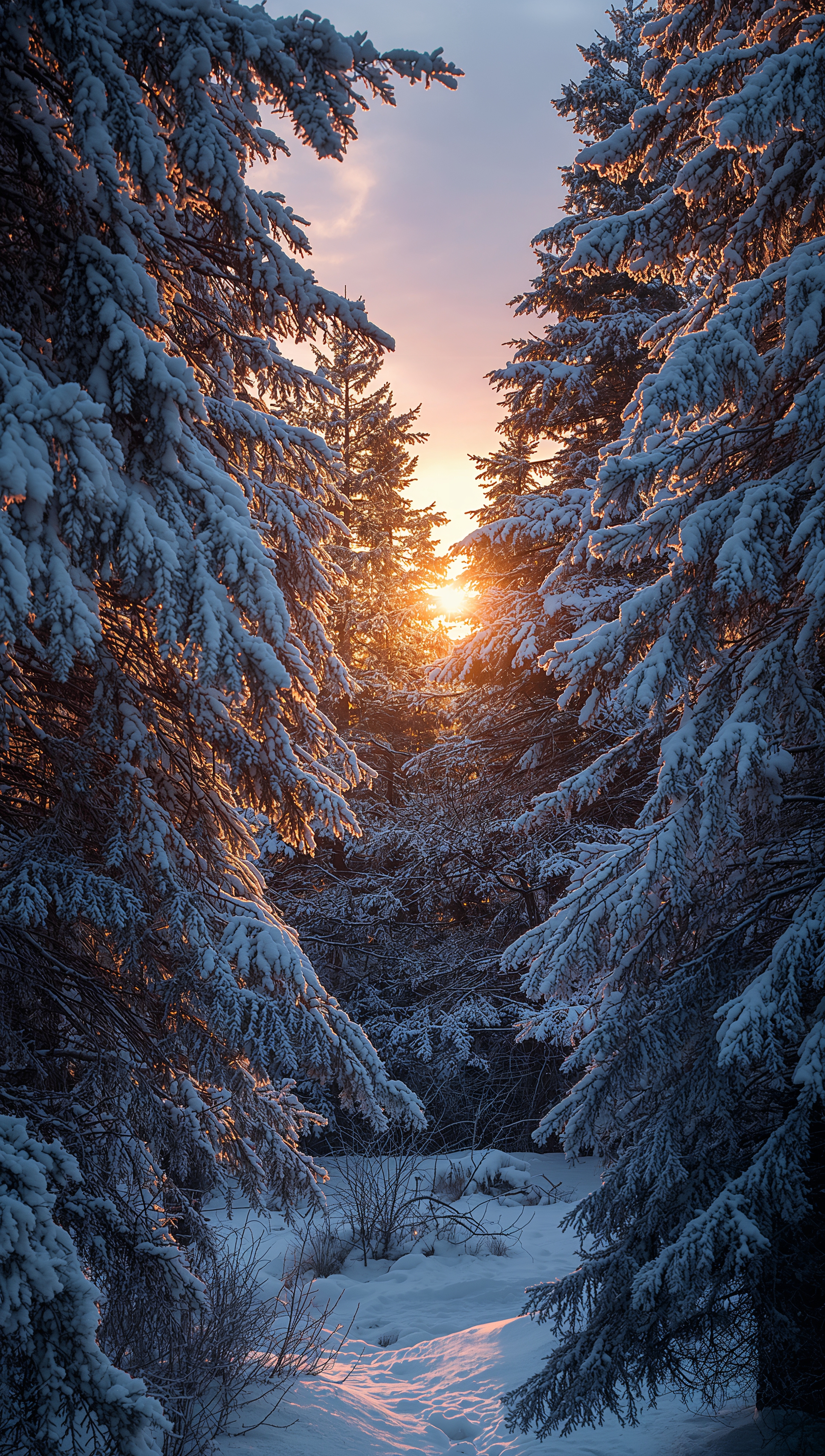 Snowy pine forest at sunrise – December wallpaper 2176x3840 Snowy pine forest at sunrise – December wallpaper