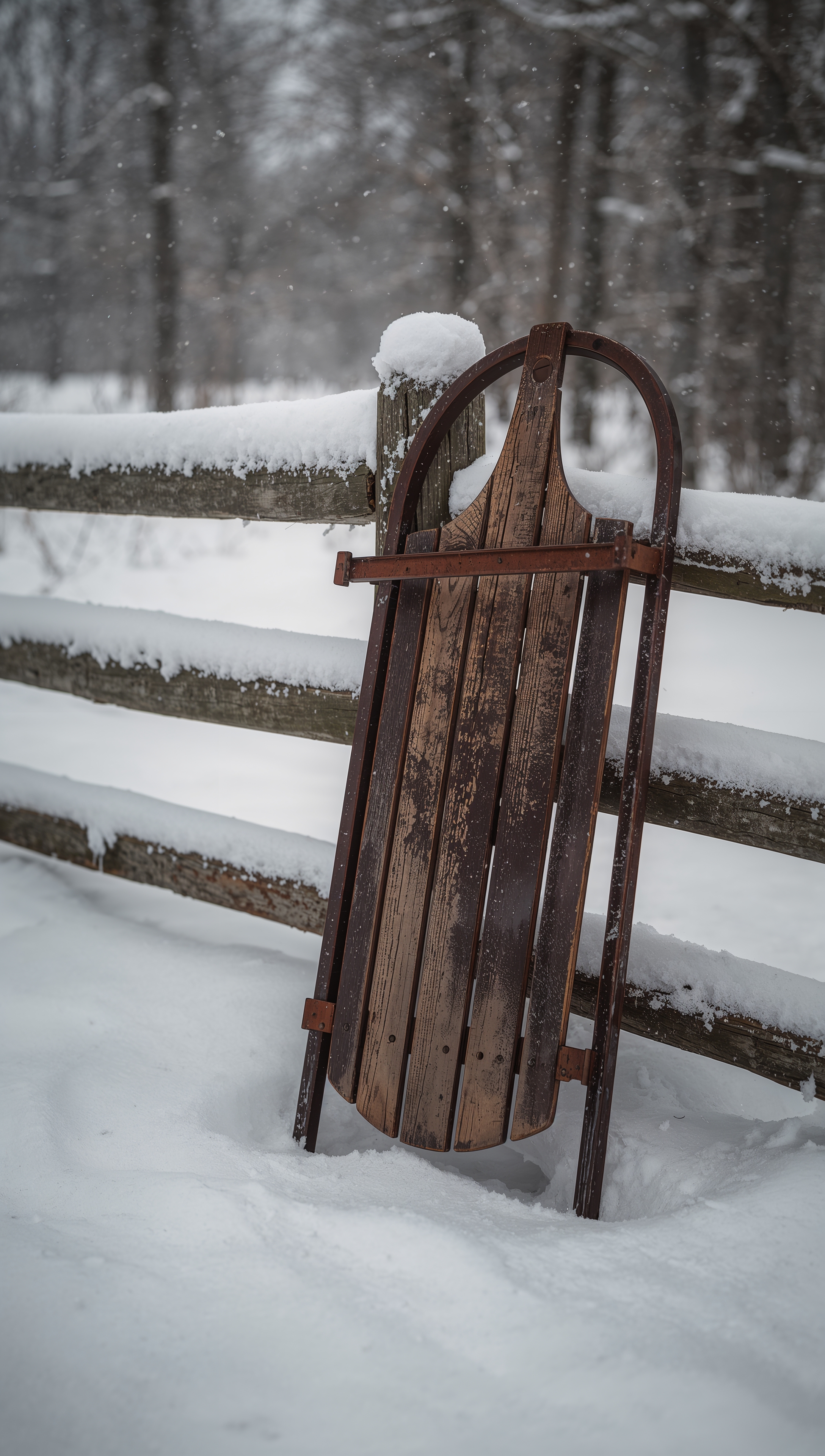 Wooden sled on snowy fence – December wallpaper 2176x3840 Wooden sled on snowy fence – December wallpaper