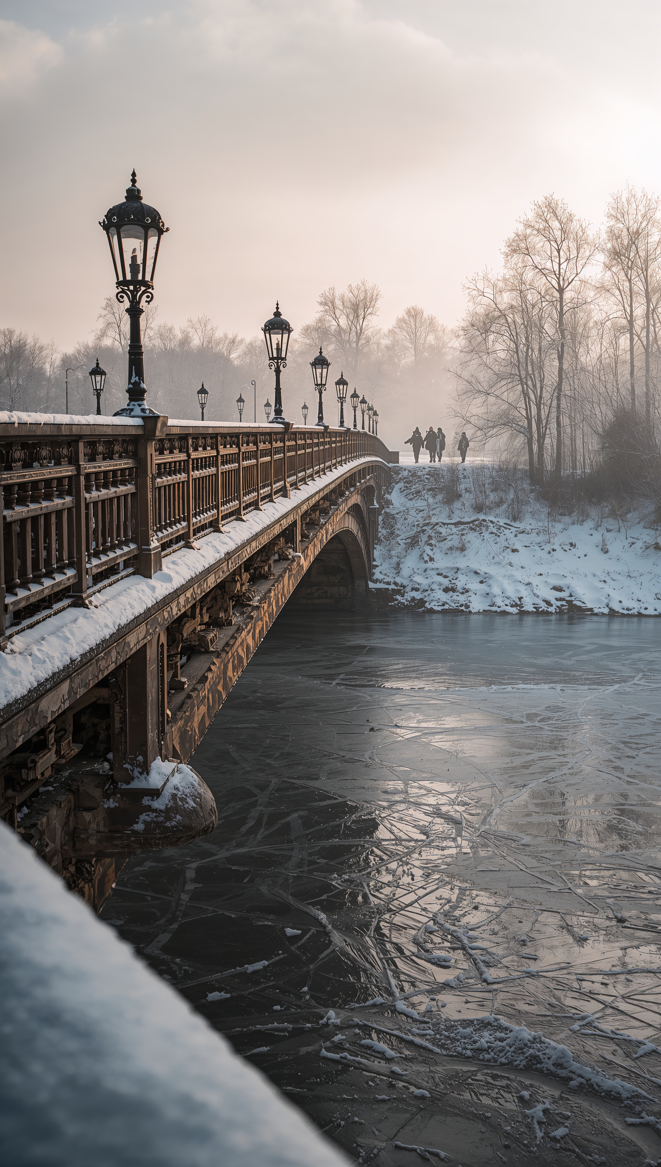 Snowy bridge over frozen river – December wallpaper 2176x3840 Snowy bridge over frozen river – December wallpaper