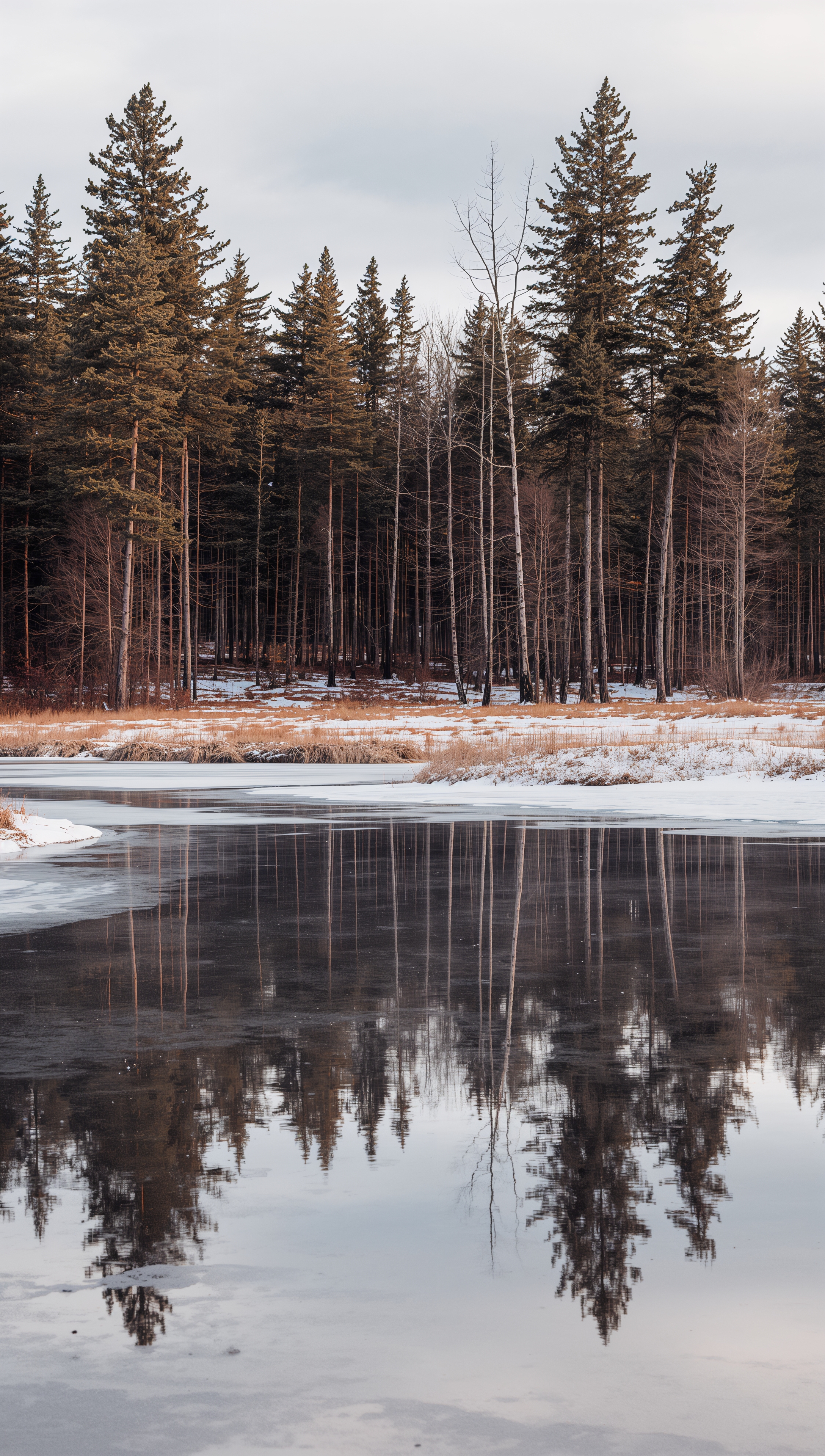 Frozen lake with pine reflection – December wallpaper 2176x3840 Frozen lake with pine reflection – December wallpaper