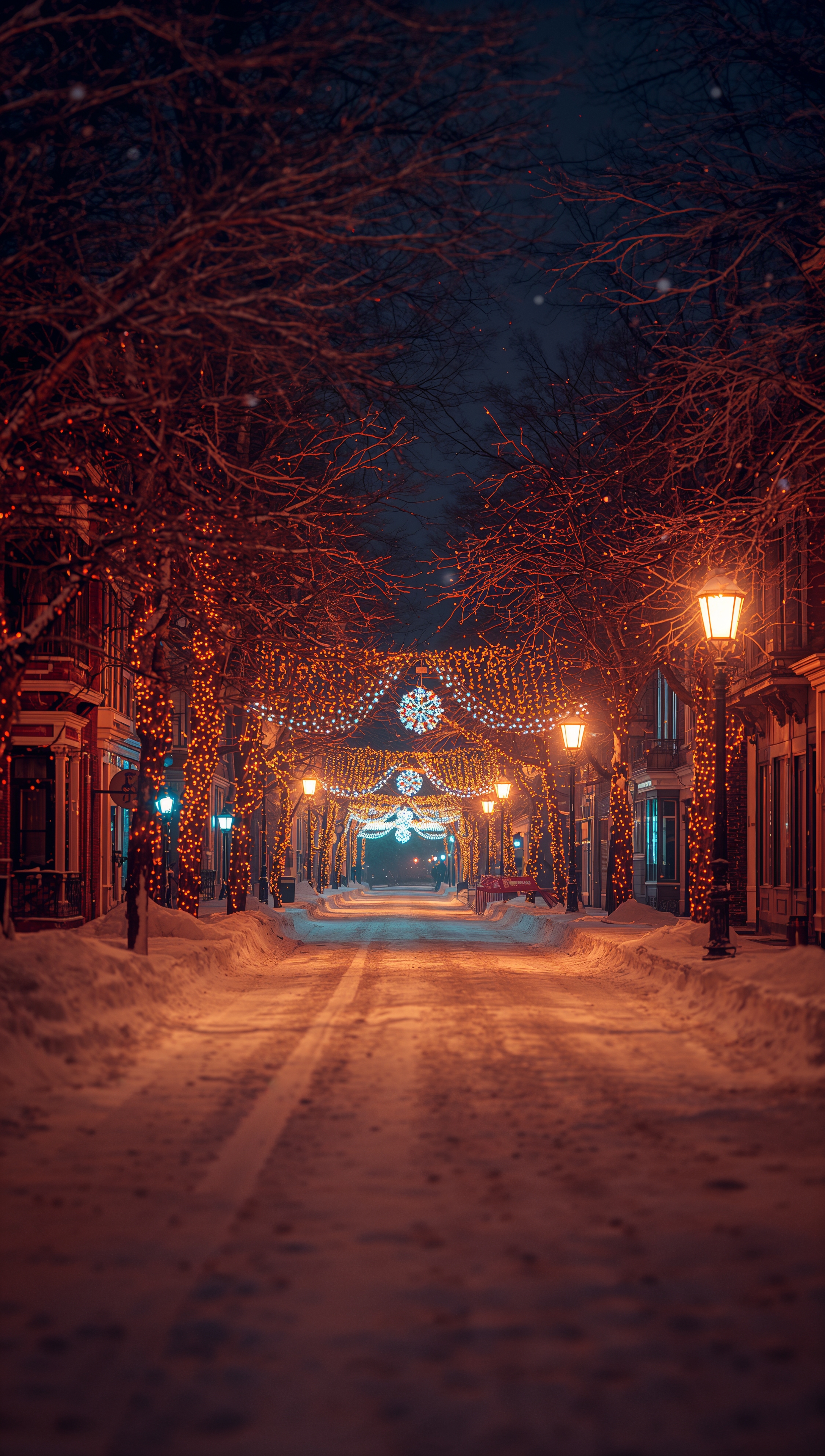 Christmas lights on snowy street – December wallpaper 2176x3840 Christmas lights on snowy street – December wallpaper