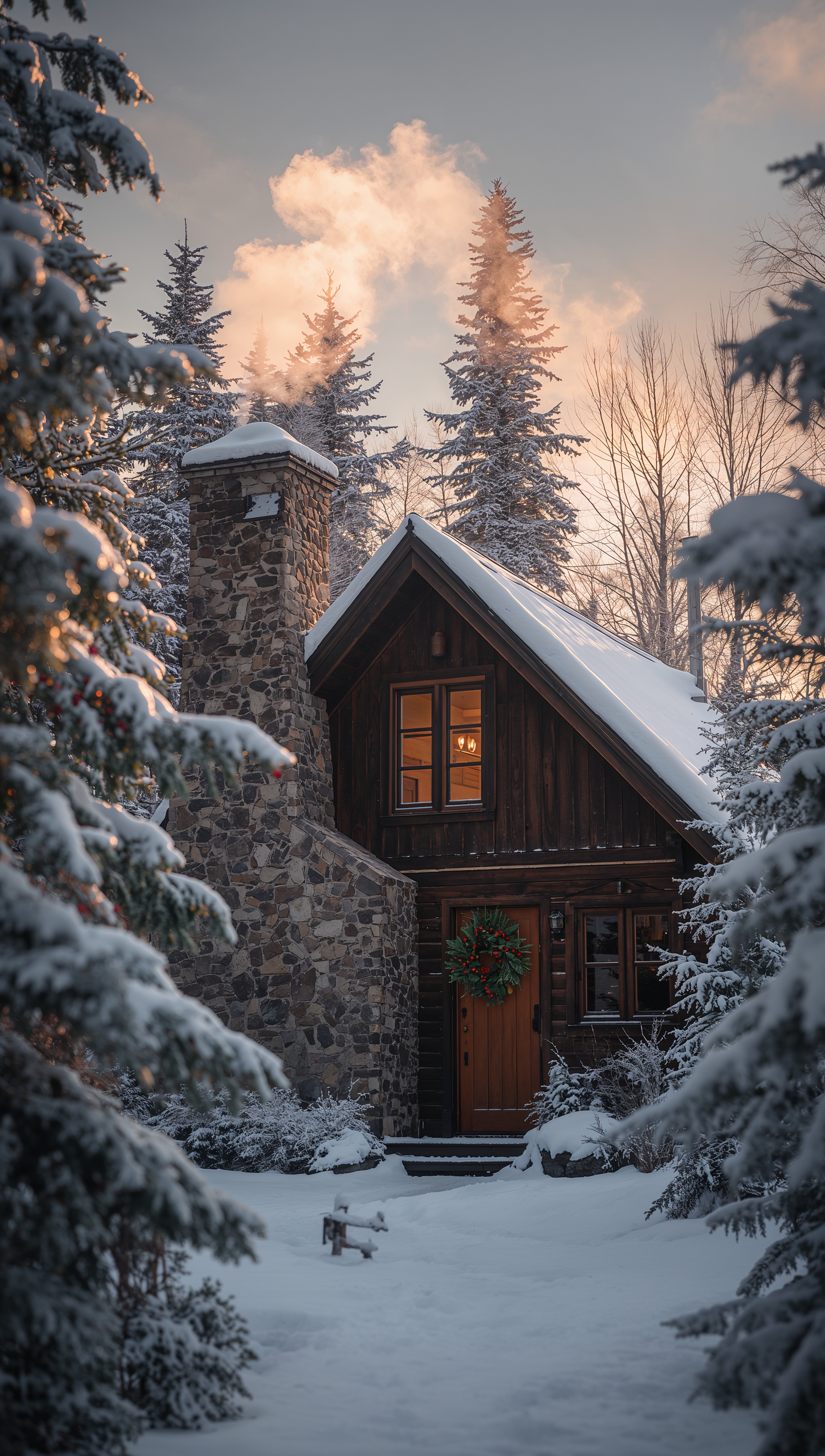Cozy winter cabin with chimney smoke – December wallpaper 2176x3840 Cozy winter cabin with chimney smoke – December wallpaper