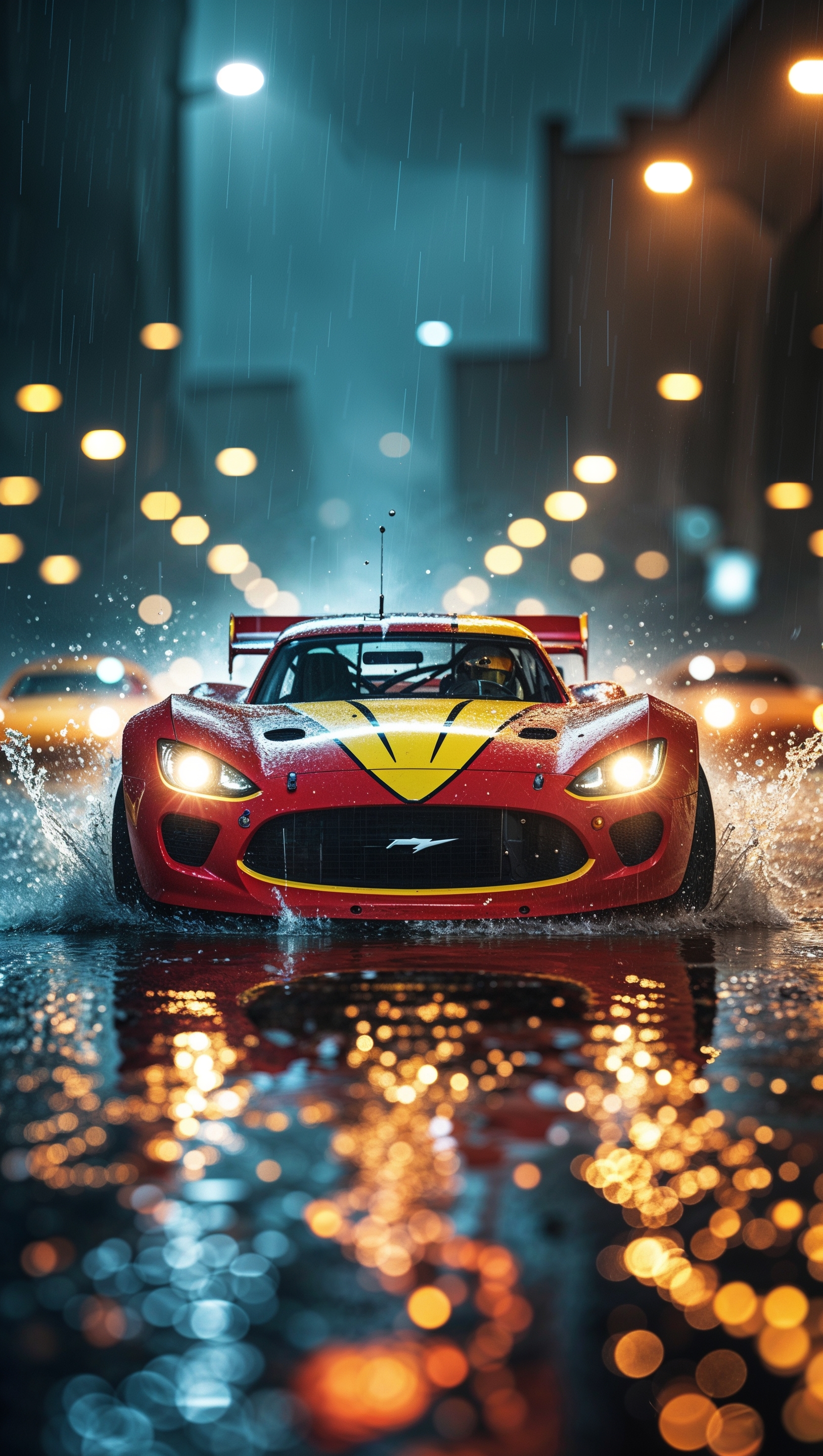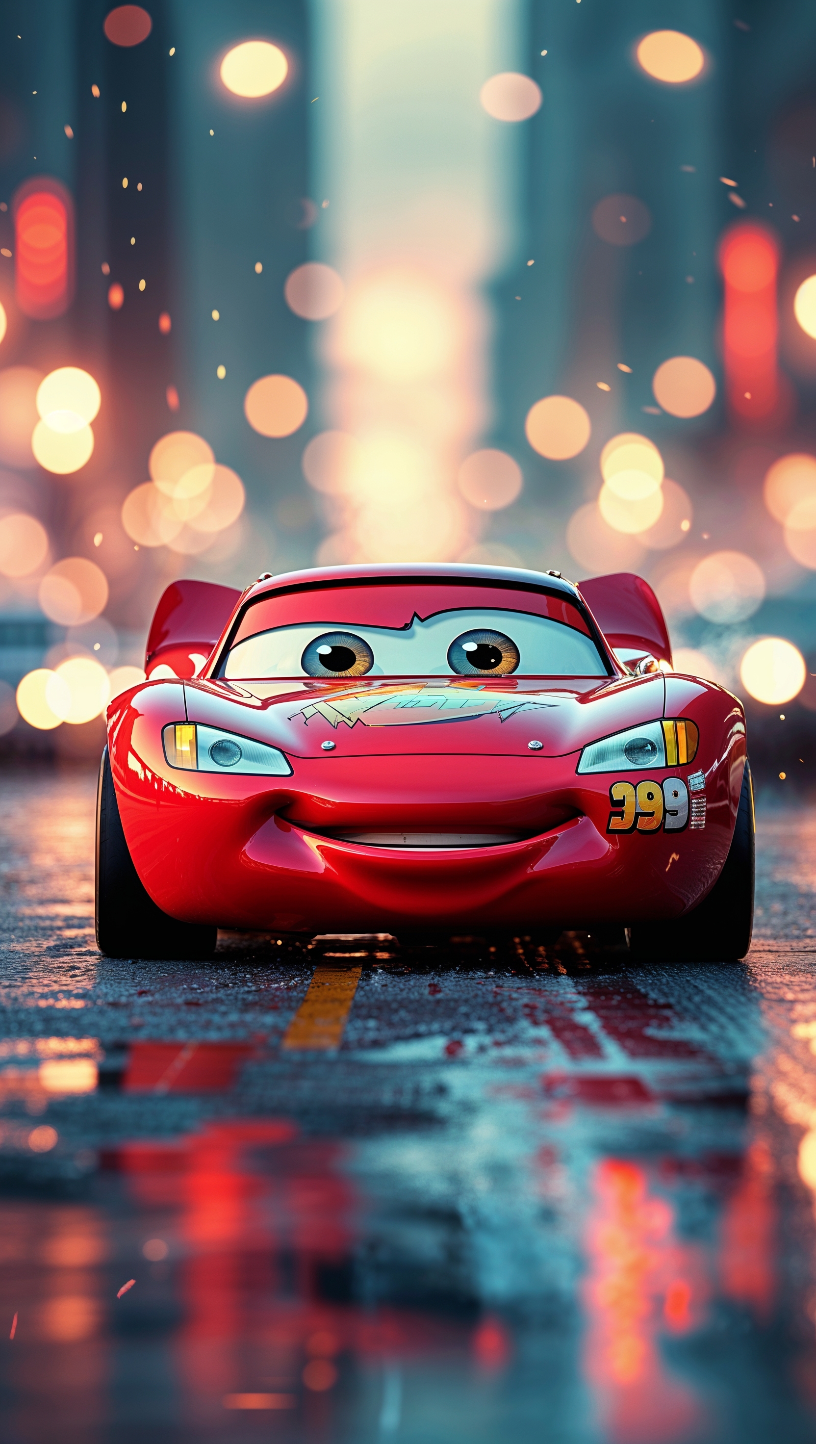 Lightning McQueen in a night race with rain and stunning light reflections, designed for iPhone wallpaper 1664x2944 Lightning McQueen in a night race with rain and stunning light reflections, designed for iPhone wallpaper