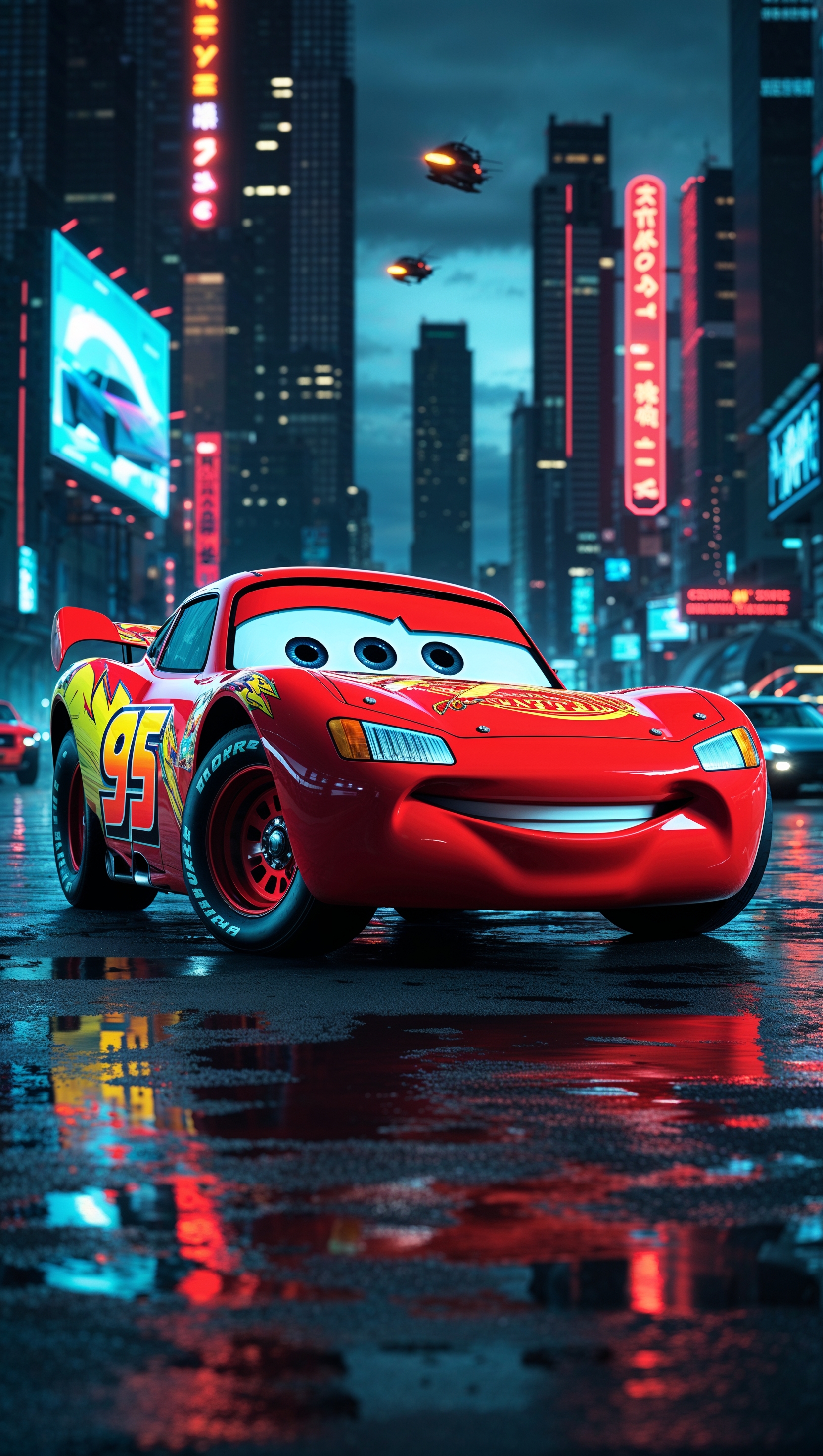 Lightning McQueen in a cyberpunk style with neon lights and a futuristic background for iPhone wallpaper 1664x2944 Lightning McQueen in a cyberpunk style with neon lights and a futuristic background for iPhone wallpaper