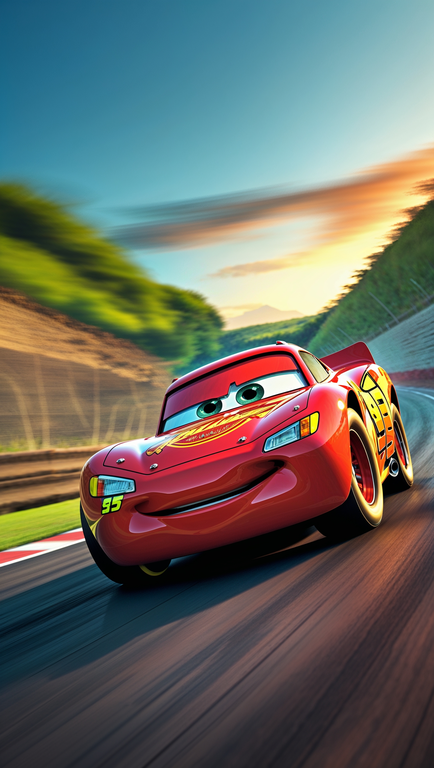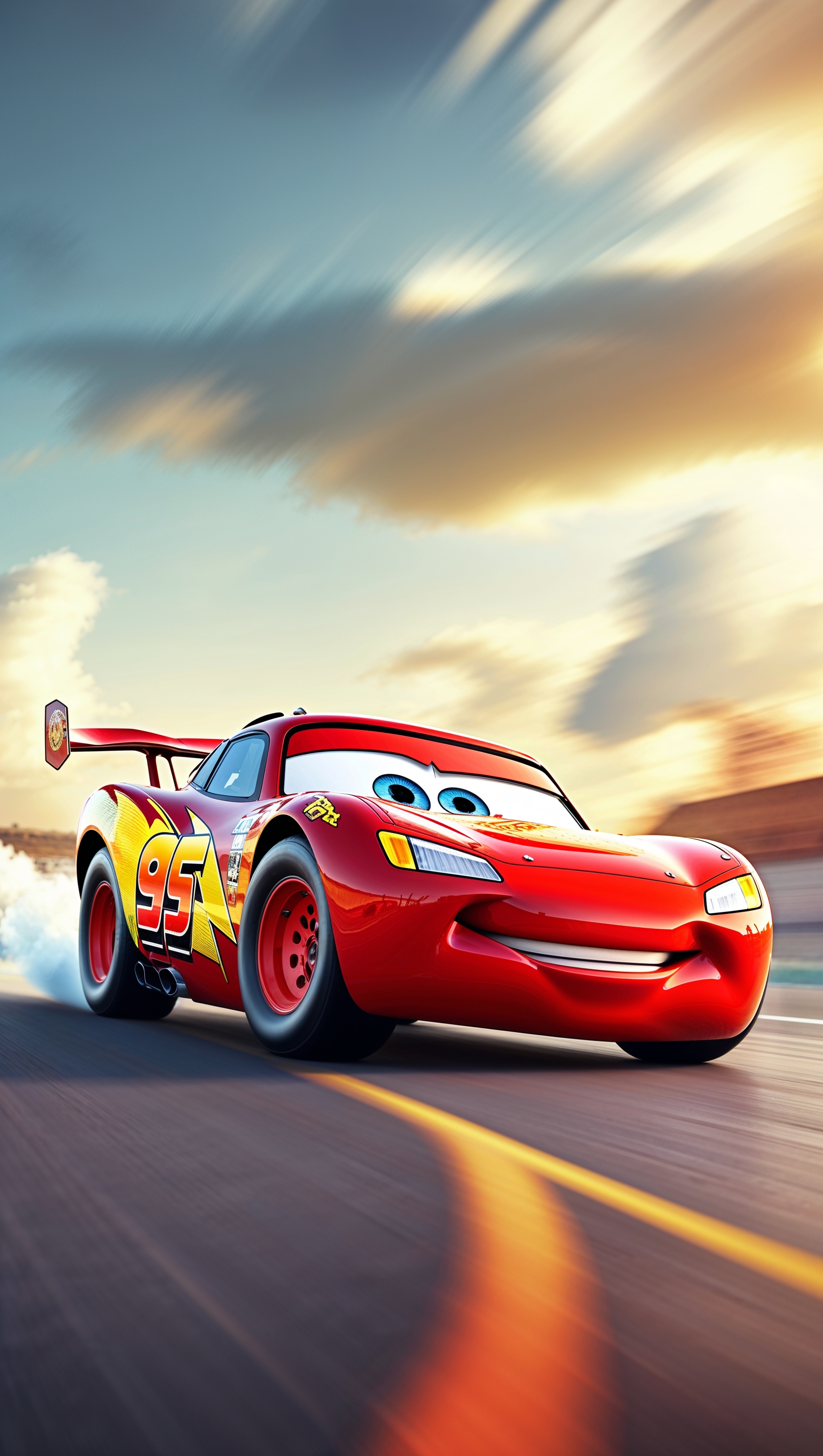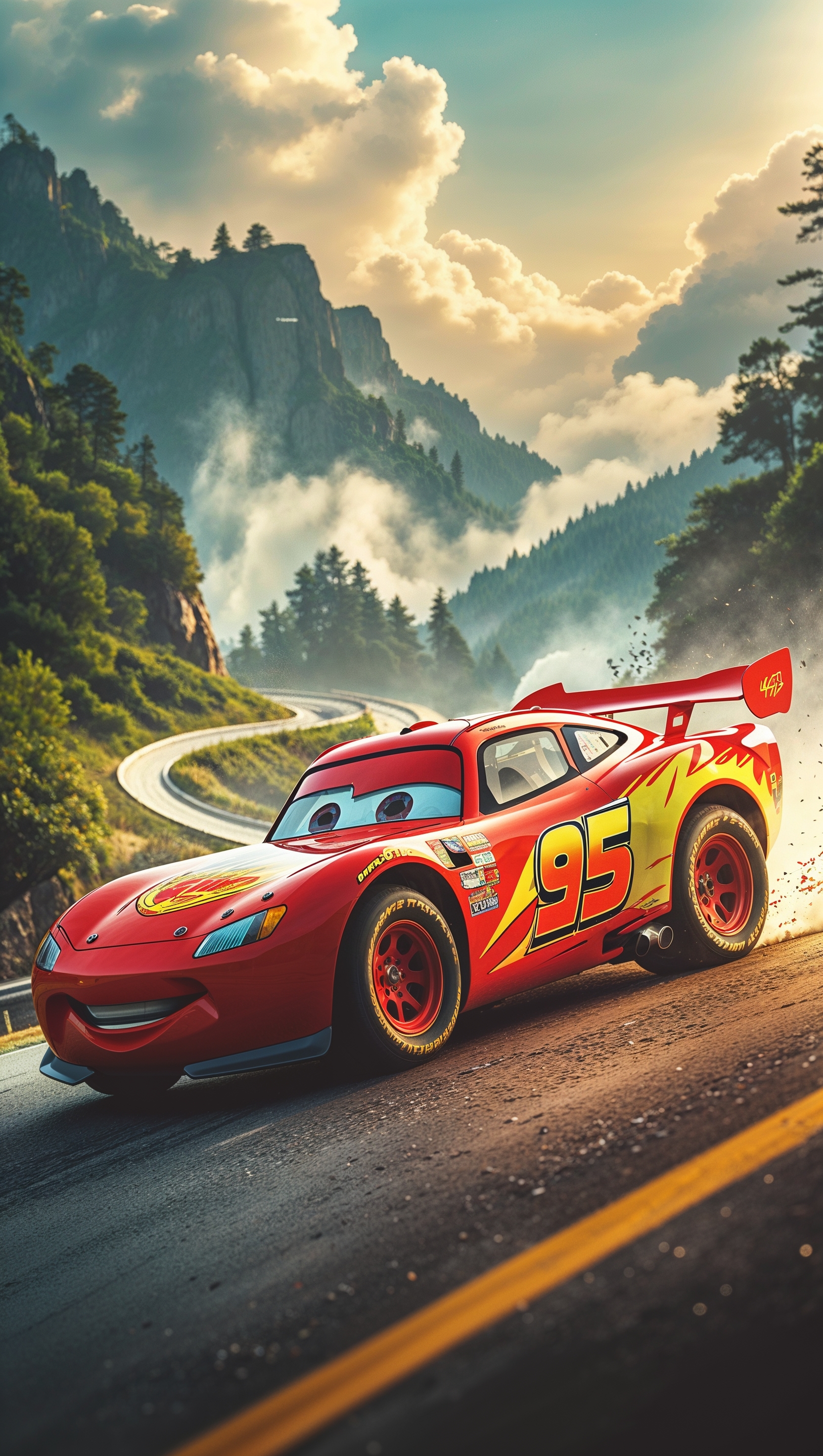 A picture of Lightning McQueen drifting on a mountain road, with a beautiful background for iPhone wallpaper 1664x2944 A picture of Lightning McQueen drifting on a mountain road, with a beautiful background for iPhone wallpaper