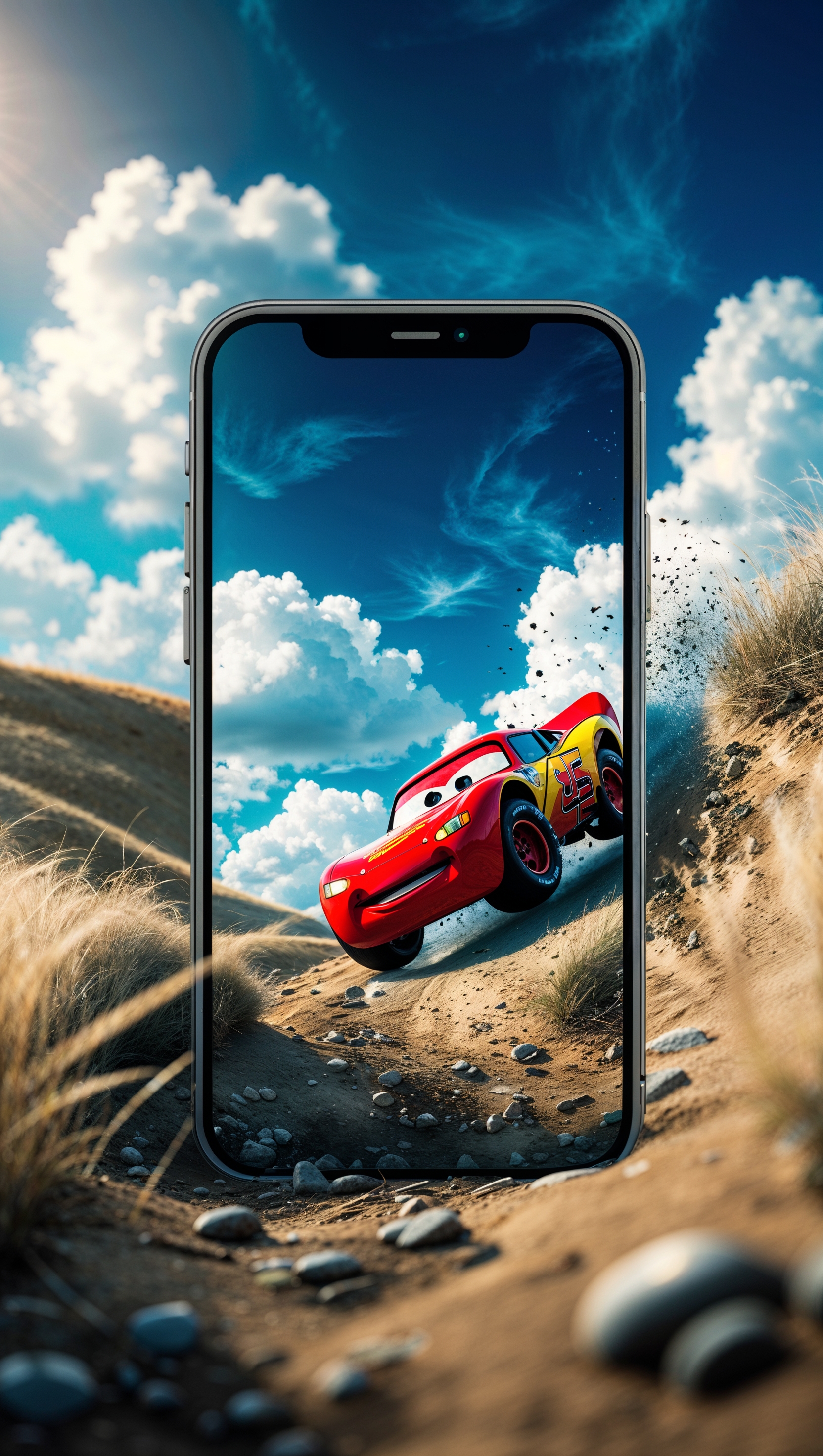 An iPhone wallpaper featuring Lightning McQueen jumping over dirt hills 1664x2944 An iPhone wallpaper featuring Lightning McQueen jumping over dirt hills