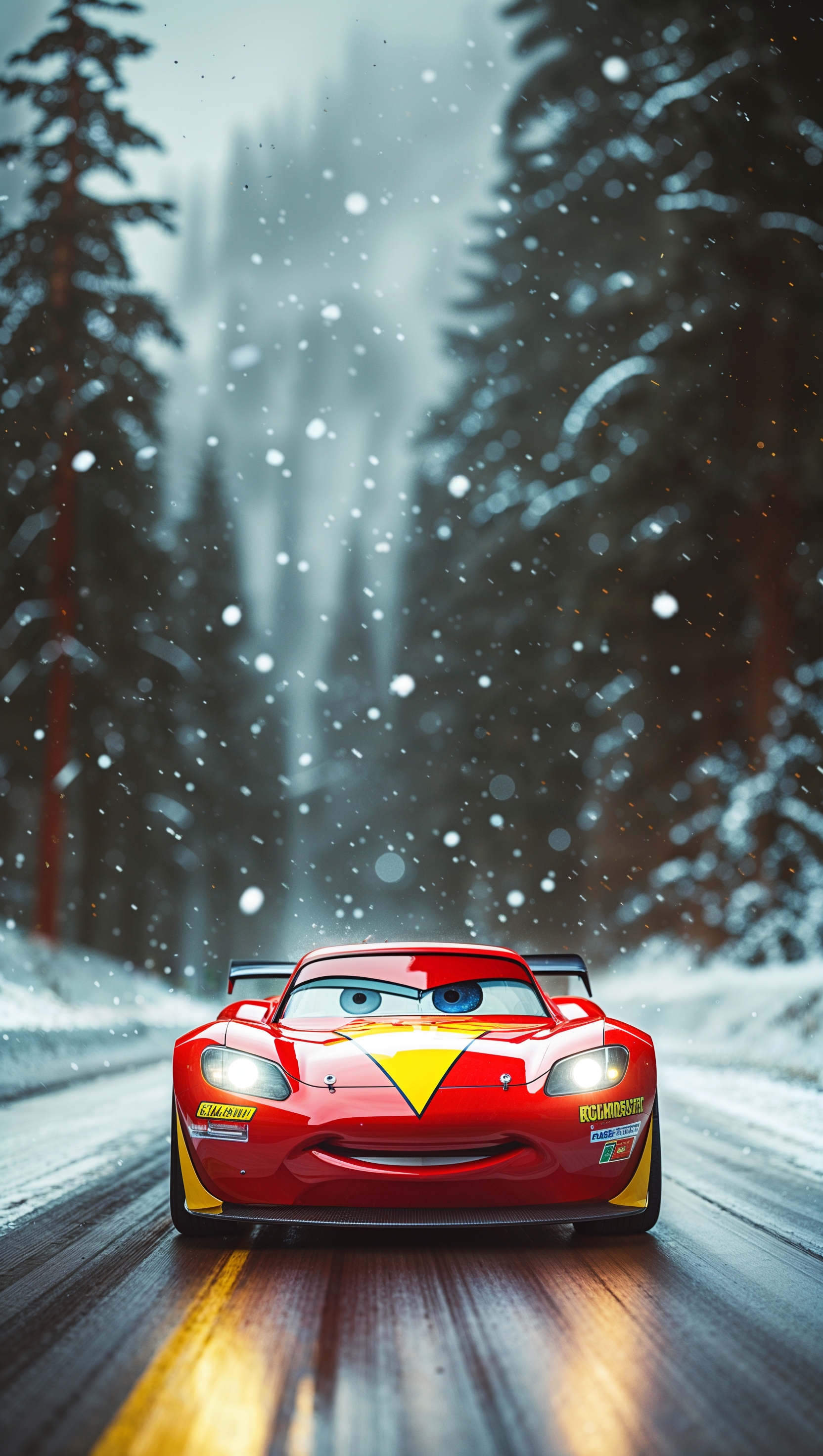 Lightning McQueen on a snowy road with realistic effects for iPhone wallpaper 1664x2944 Lightning McQueen on a snowy road with realistic effects for iPhone wallpaper