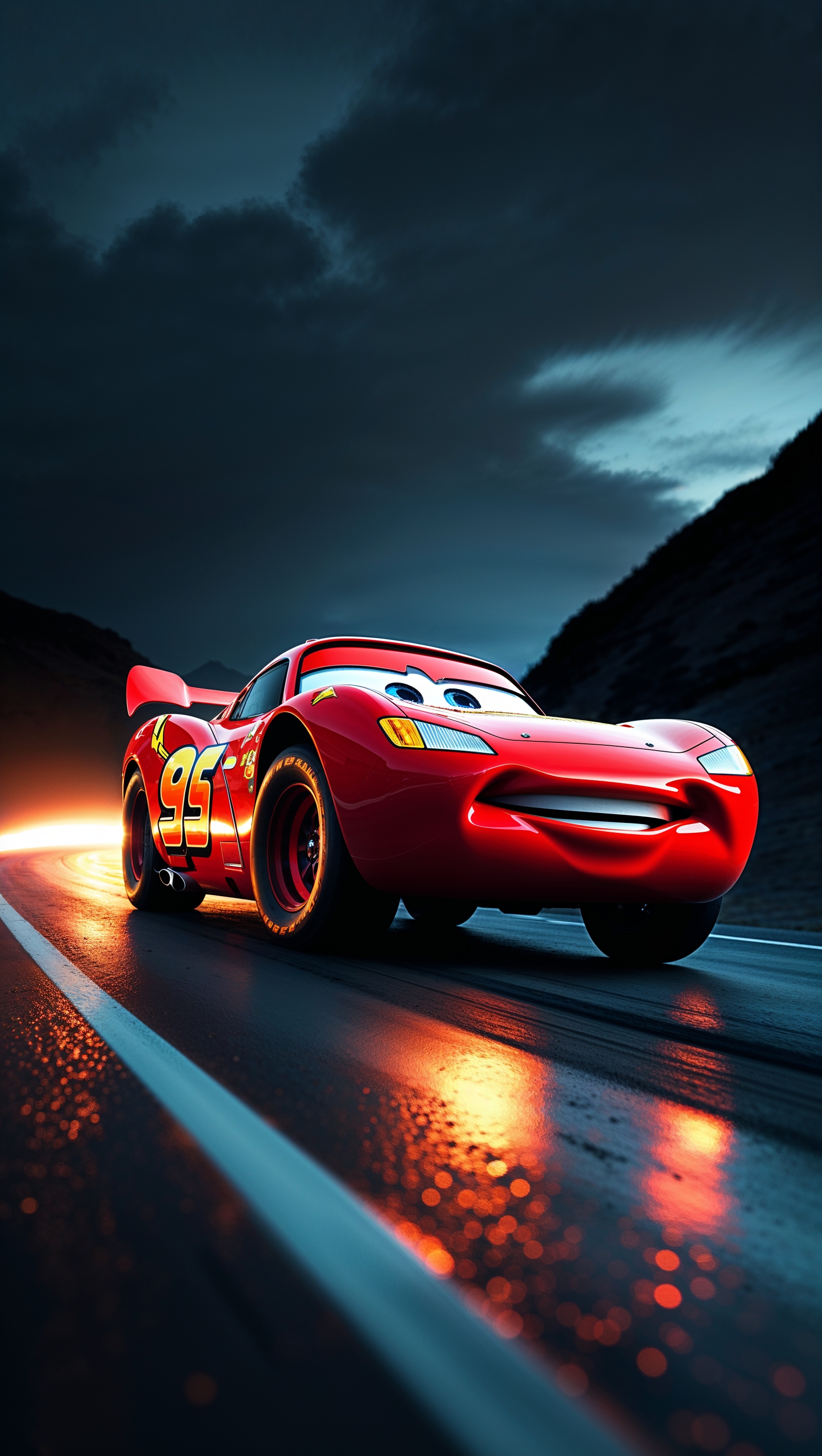 Lightning McQueen driving on a dark road with headlights on, designed for iPhone wallpaper 1664x2944 Lightning McQueen driving on a dark road with headlights on, designed for iPhone wallpaper