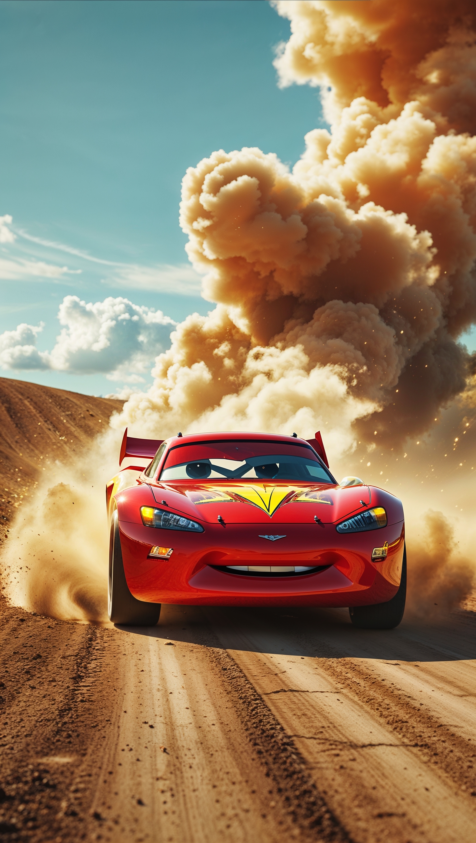 Lightning McQueen on a dirt road with dust rising from his tires, ideal for iPhone wallpaper 1664x2944 Lightning McQueen on a dirt road with dust rising from his tires, ideal for iPhone wallpaper