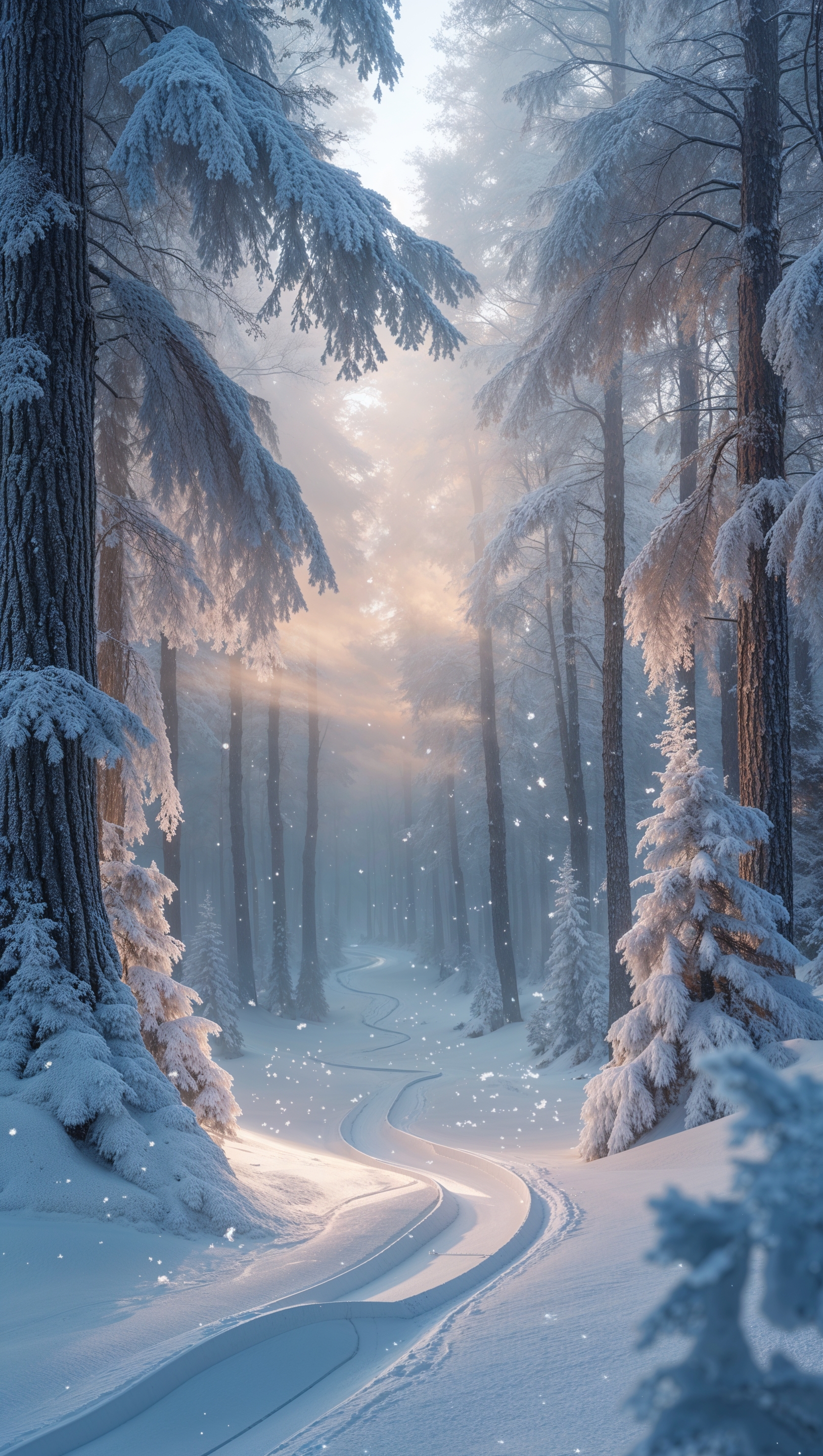 1664x2944 Frozen forest with a snowboard track through the trees, dreamy aesthetic