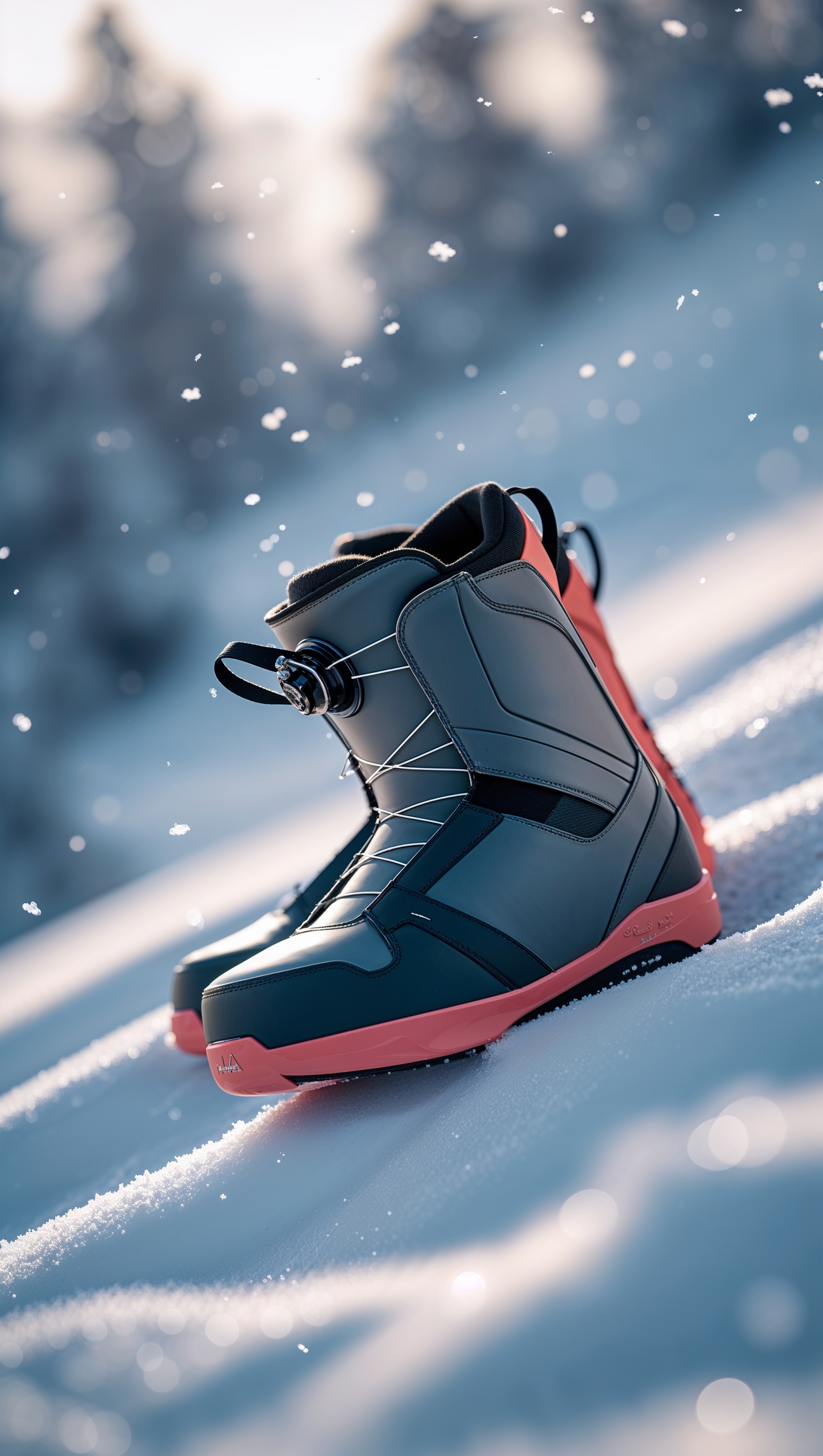 1664x2944 Close-up of snowboard boots on fresh snow, minimalist iPhone wallpaper