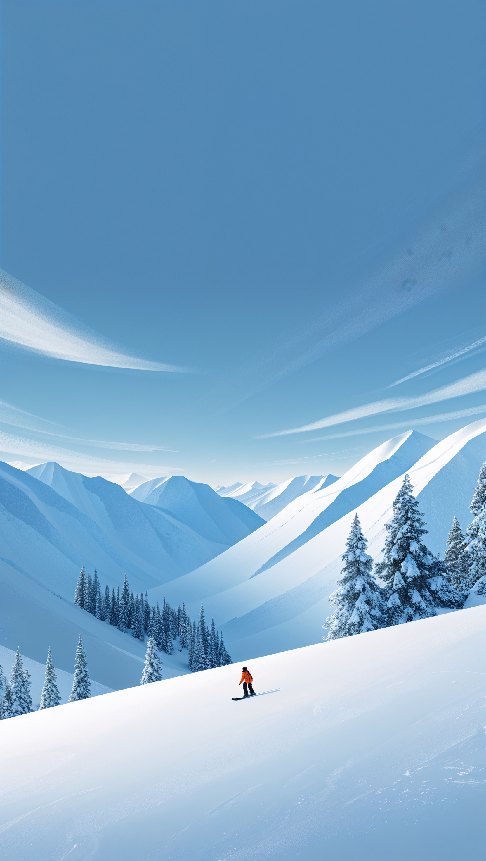 1664x2944 Snow-covered mountains with a tiny snowboarder in the distance, minimalist