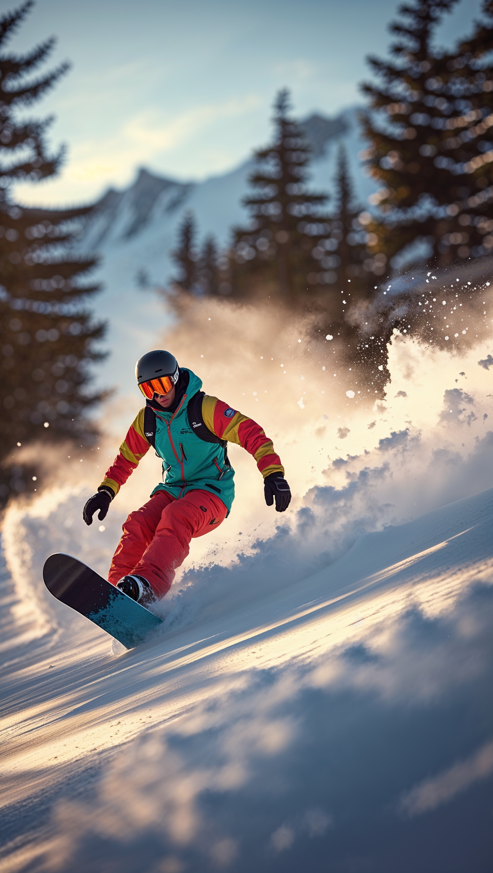 1664x2944 A snowboarder carving down a steep slope with snow flying around, cinematic style