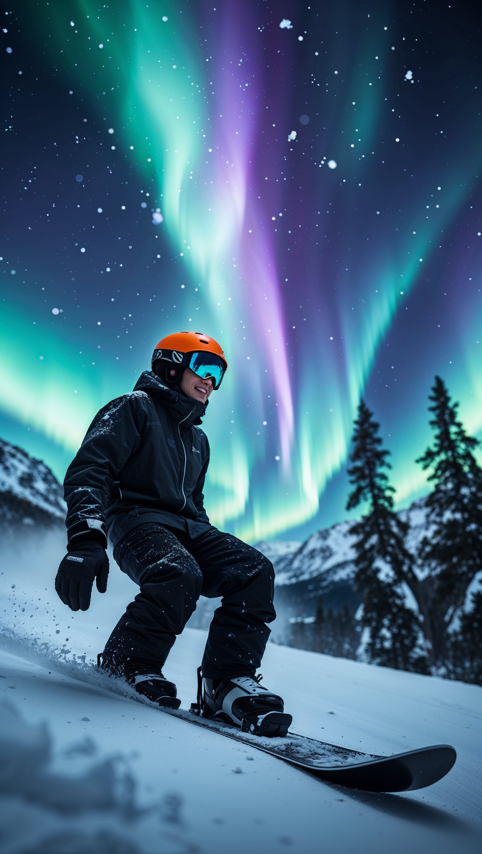 1664x2944 Night snowboarding under northern lights, vivid colors, vertical iPhone wallpaper