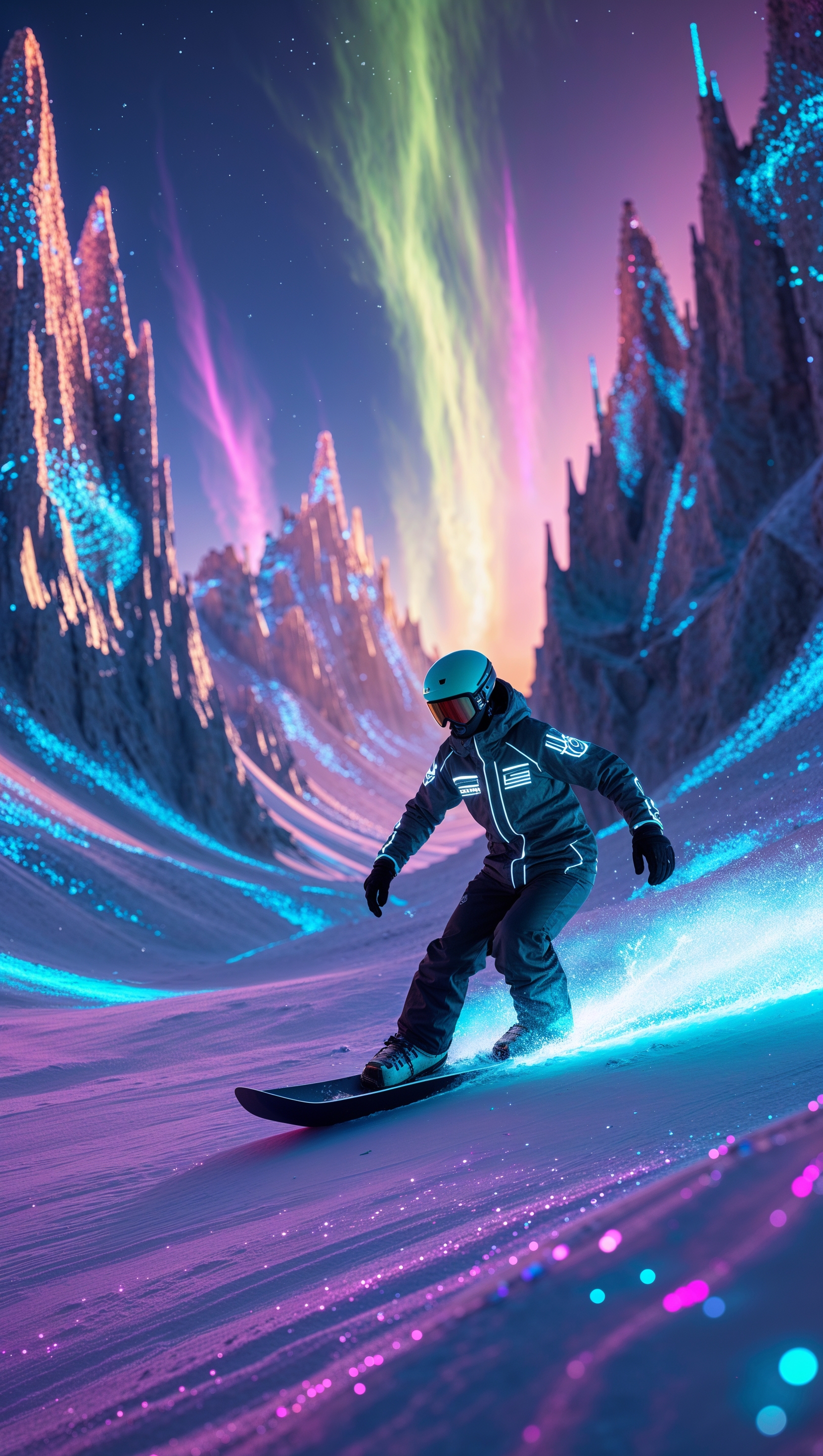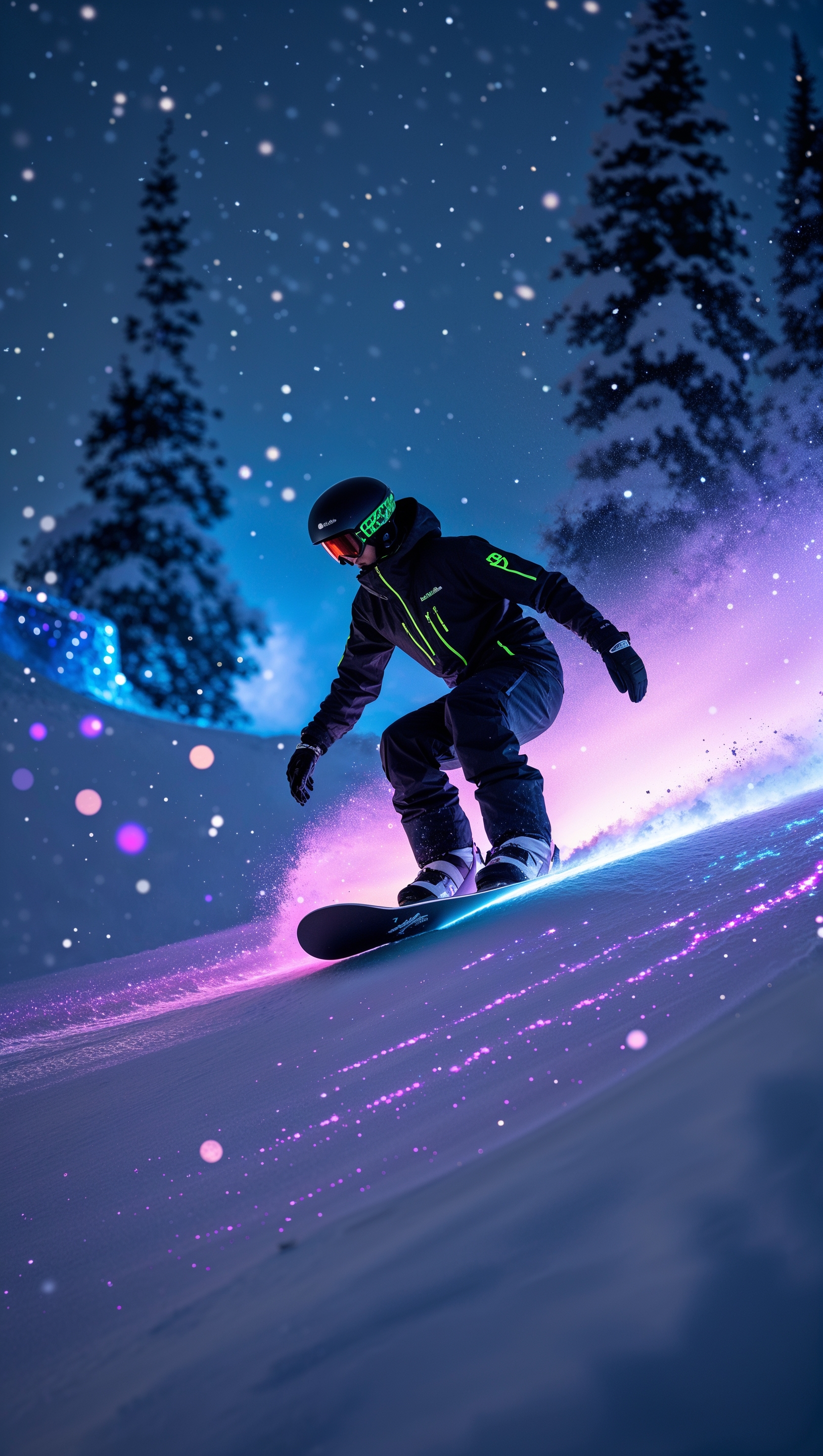 1664x2944 Snowboarder leaving a glowing trail on the snow at night, fantasy lighting