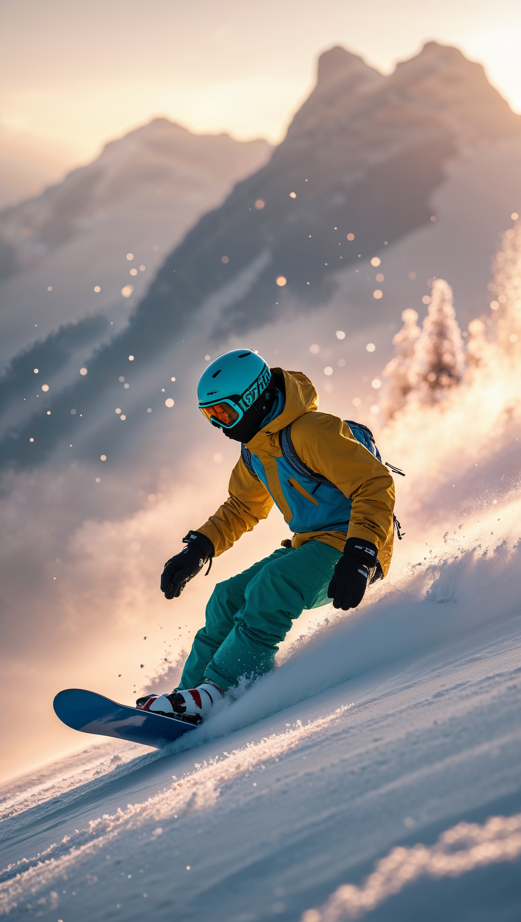 1664x2944 Snowboarding at dawn, soft light and misty mountains in the background