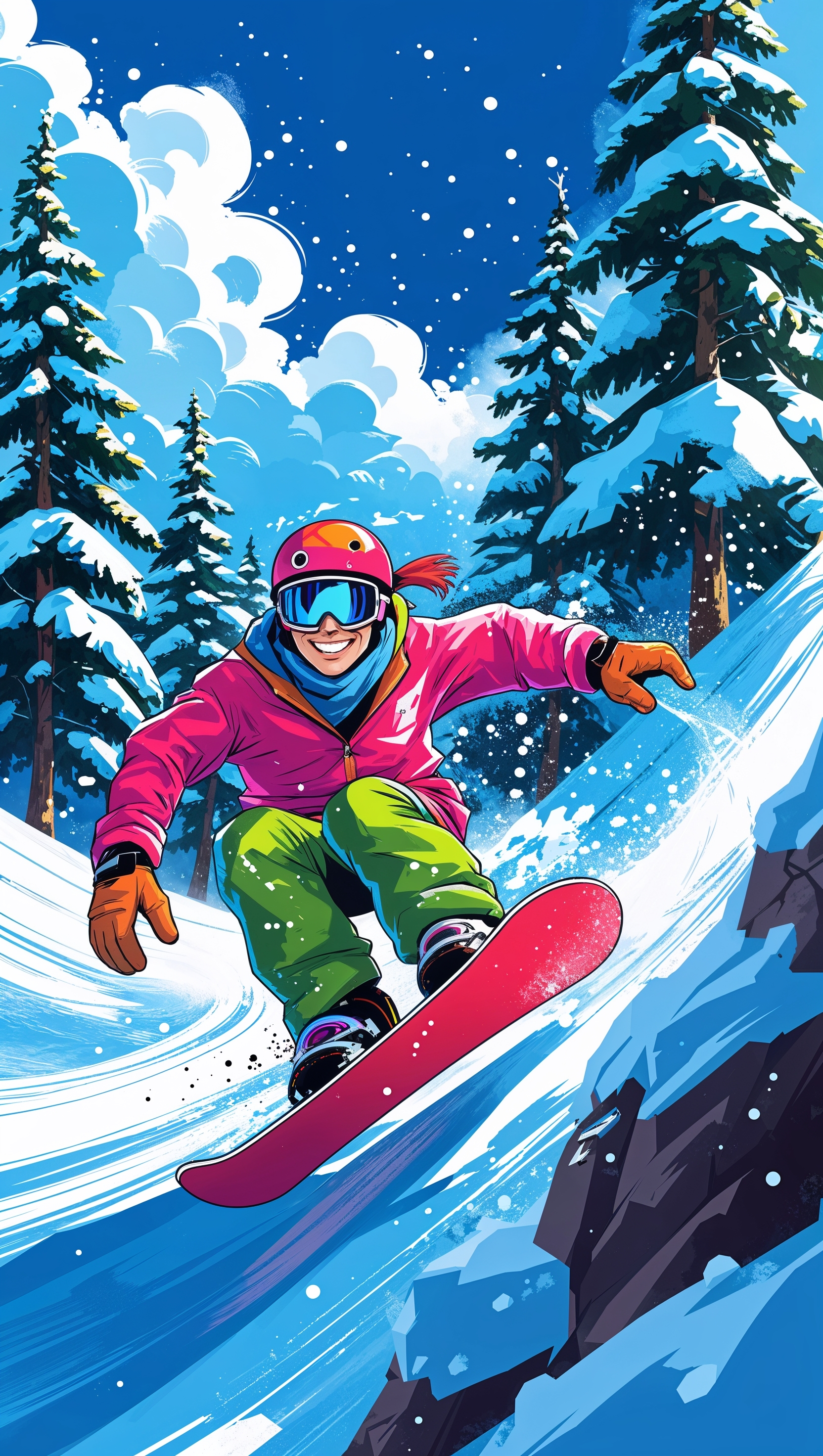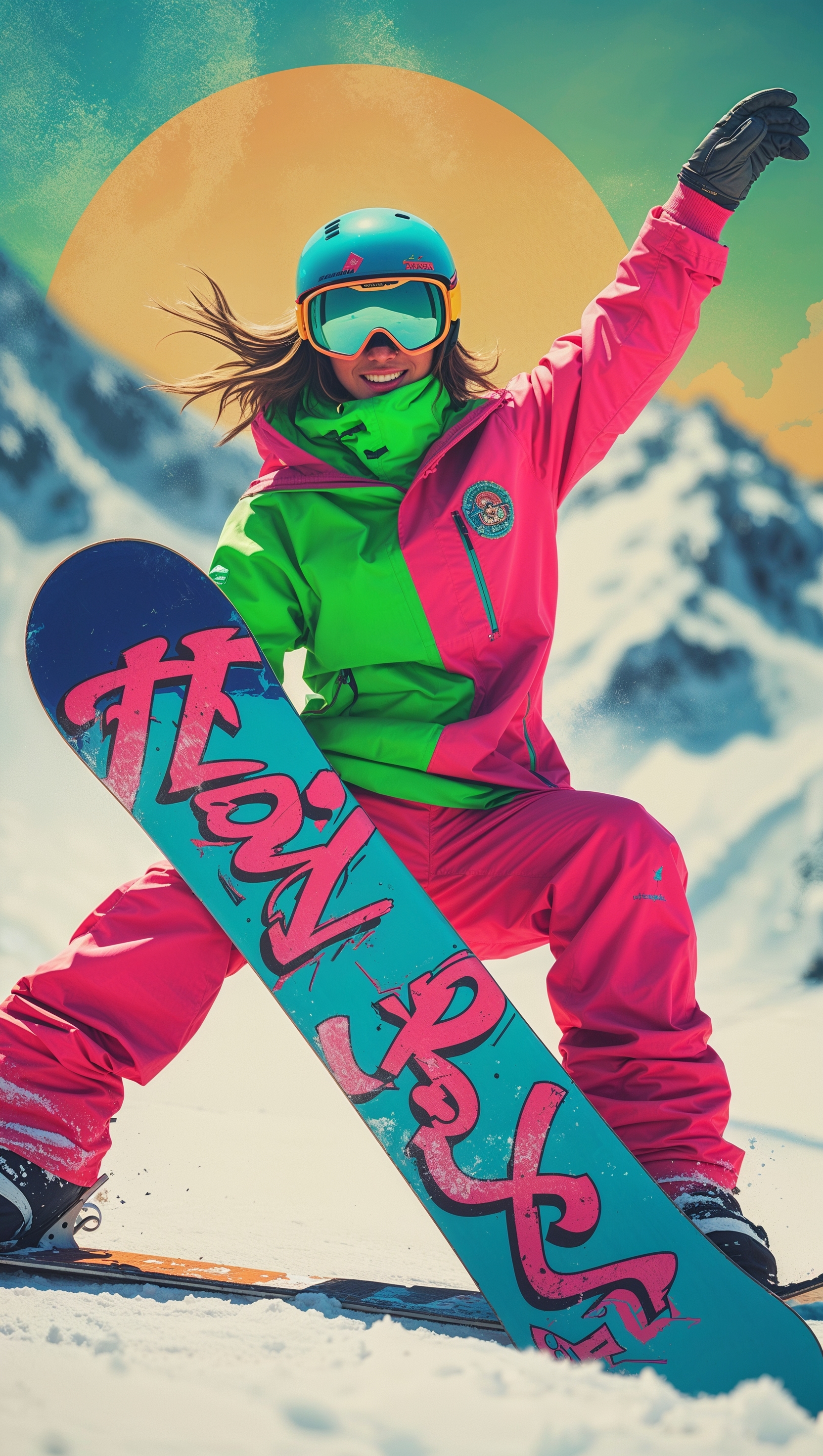 1664x2944 Retro-style snowboarding with 80s colors and grainy texture, vintage feel