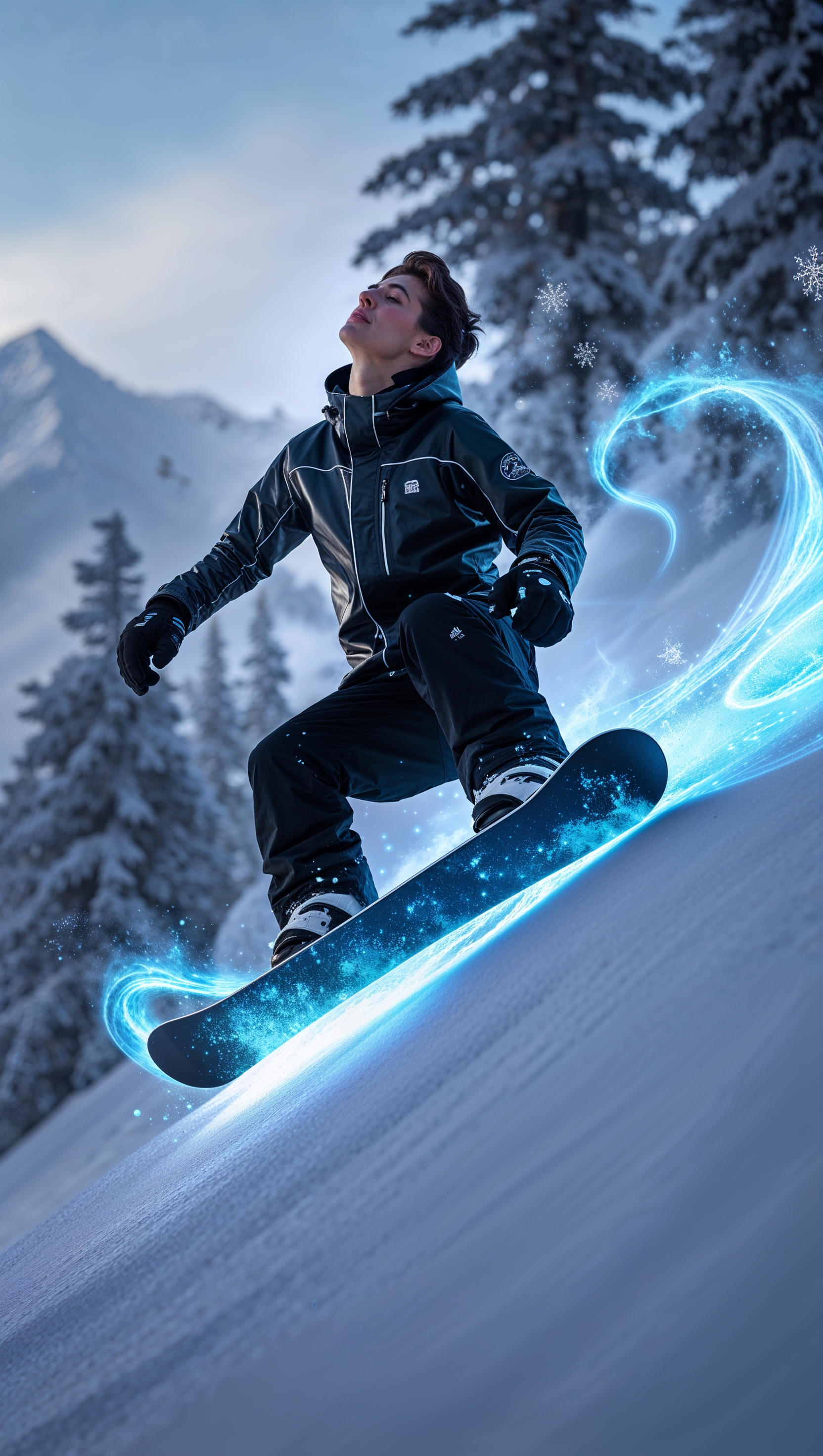 1664x2944 Snowboarder with a trail of glowing blue light behind, fantasy style
