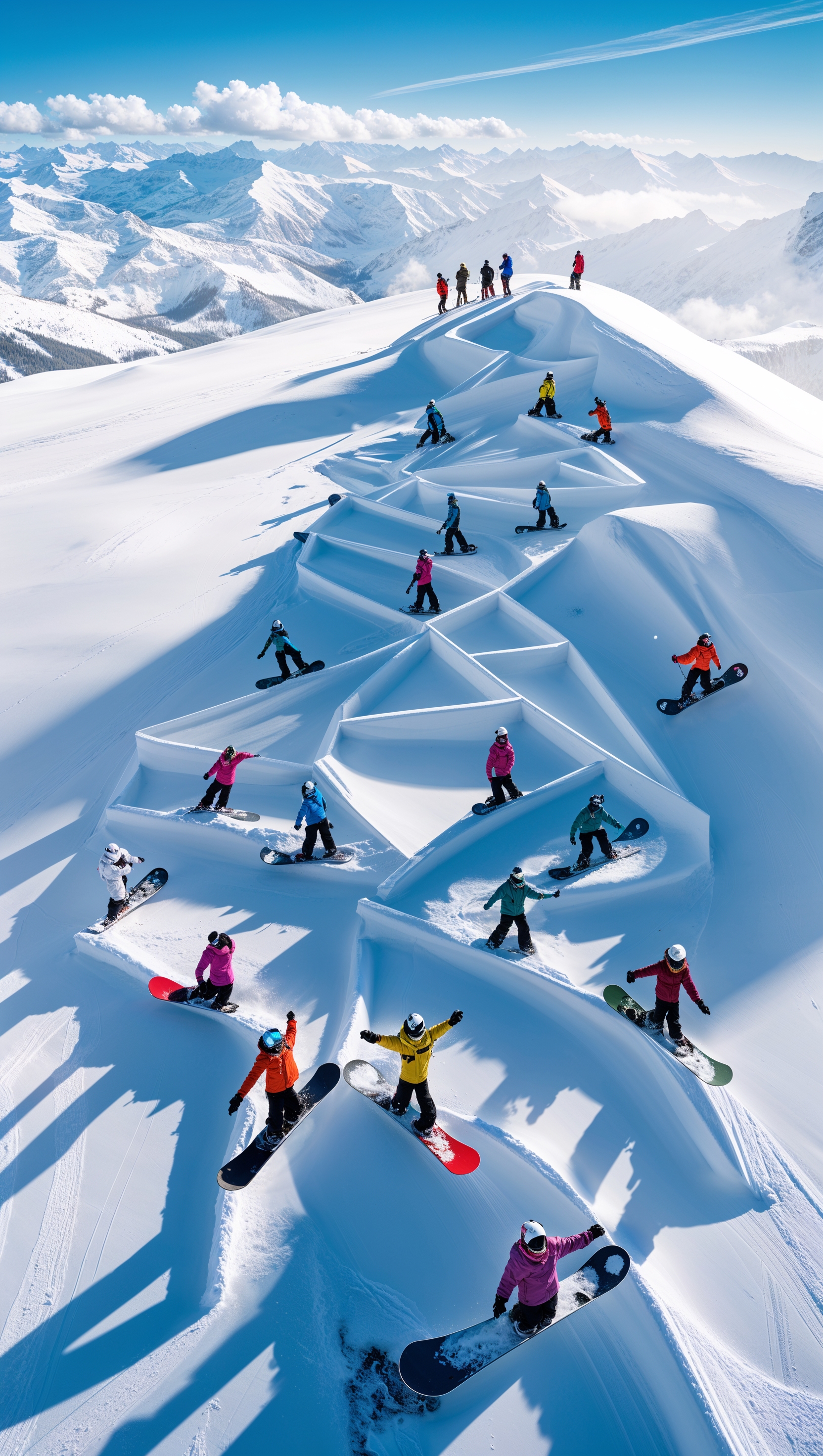 1664x2944 Aerial view of snowboarders on a snowy slope forming geometric patterns