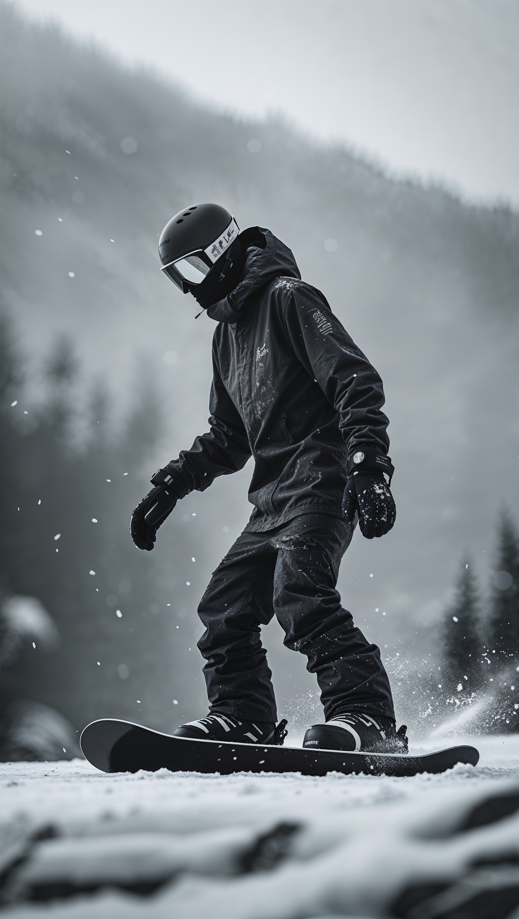 1664x2944 Moody black and white shot of a lone snowboarder, artistic aesthetic