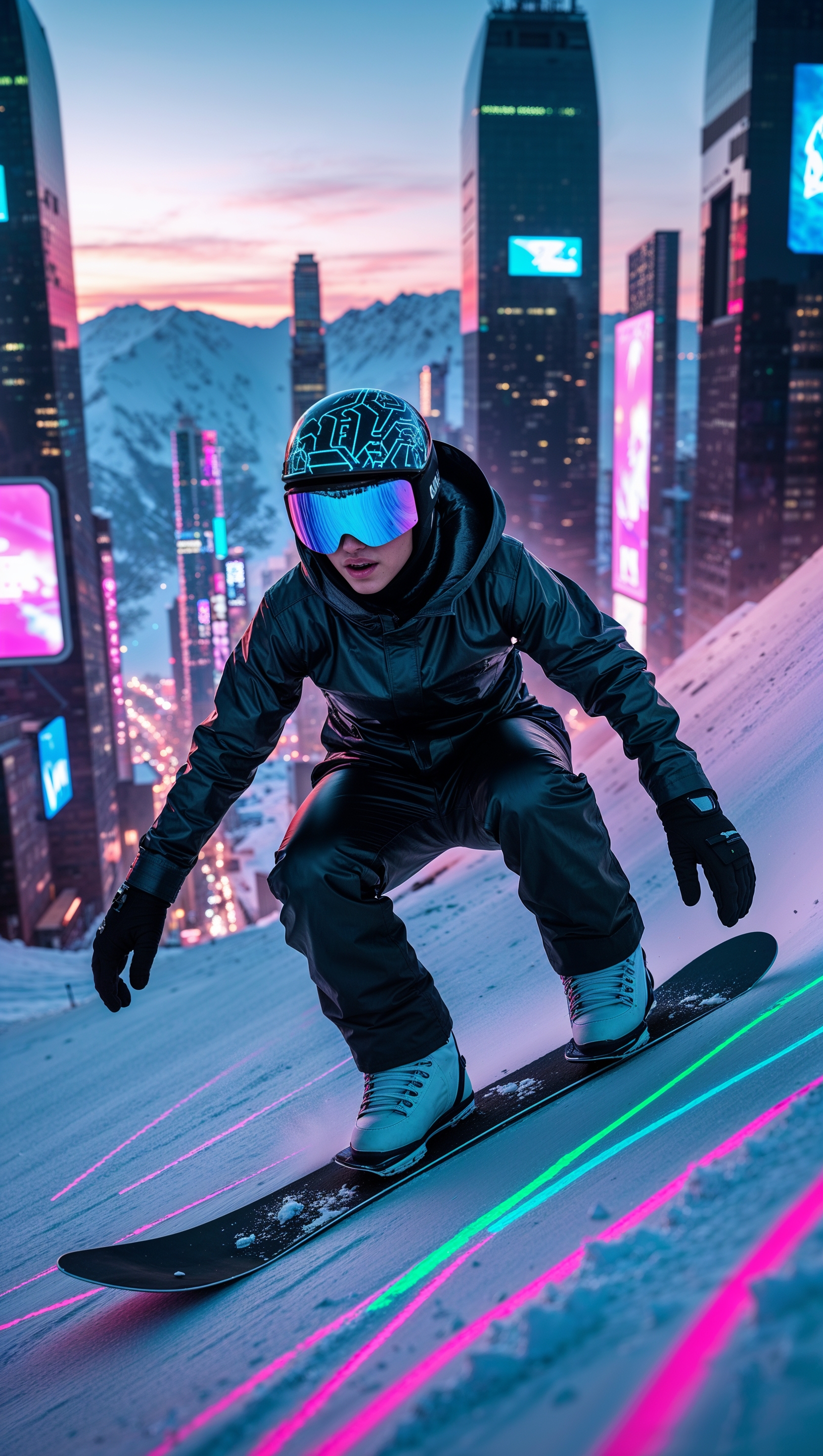 1664x2944 Cyberpunk snowboarding scene with neon lights, futuristic iPhone wallpaper