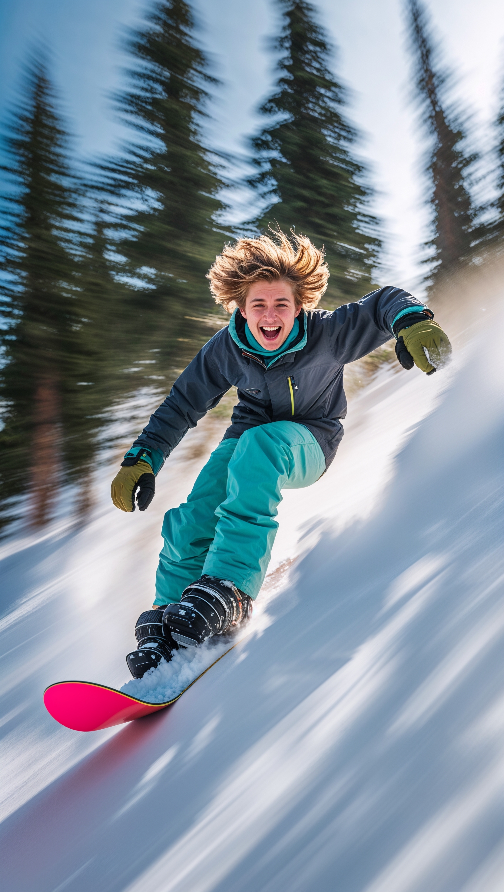 1664x2944 Snowboarder speeding down a hill with motion blur effect, dynamic feel