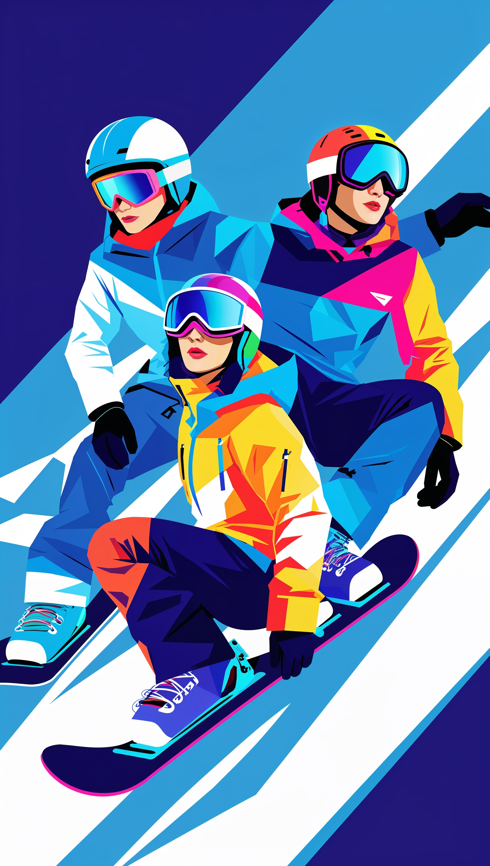 1664x2944 Stylized vector illustration of snowboarders, flat design wallpaper