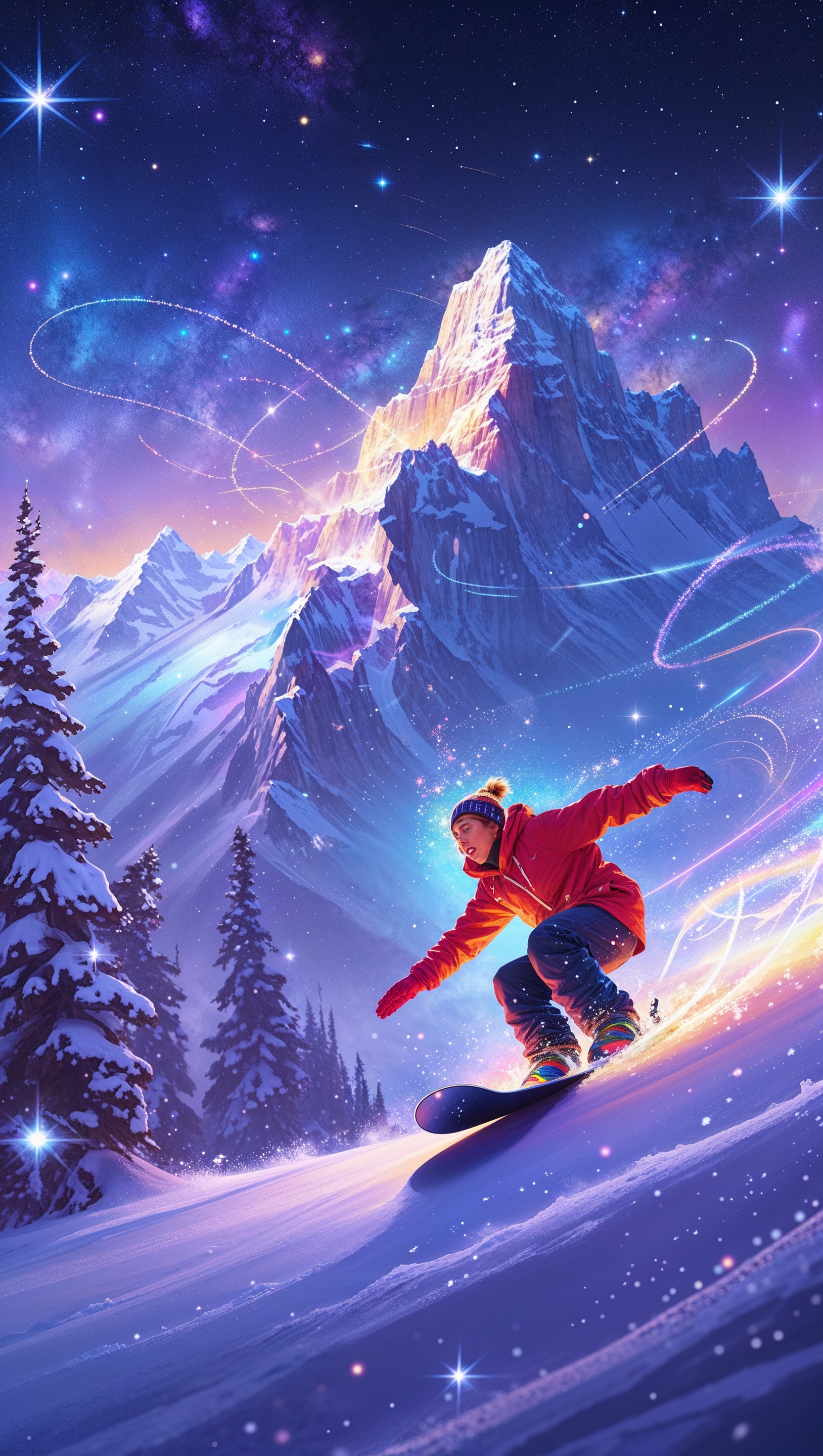 1664x2944 Magical snowboarding scene with sparkles and light trails, fantasy dreamscape