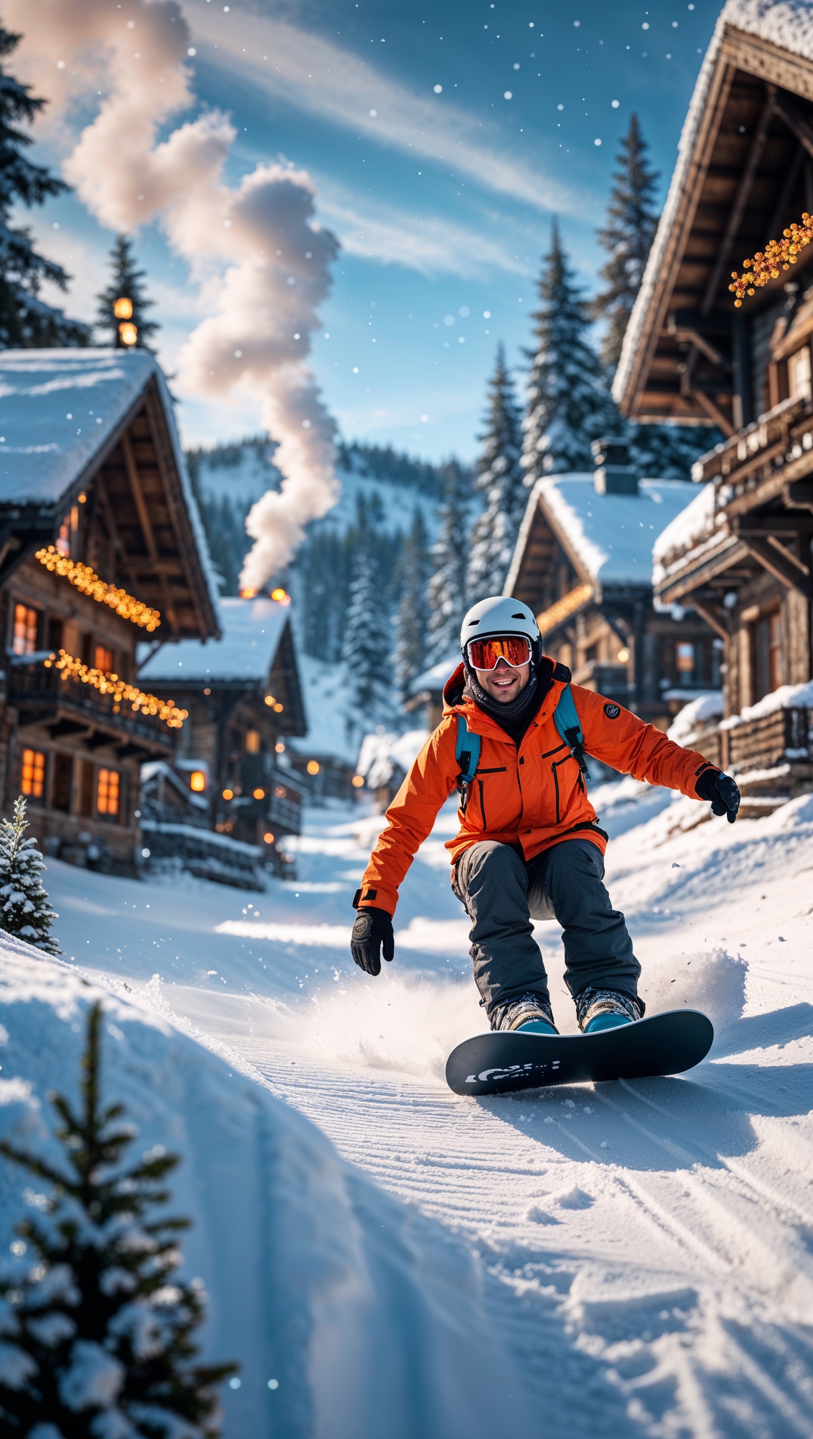 1664x2944 Snowboarding through a snow-covered village, cozy and adventurous