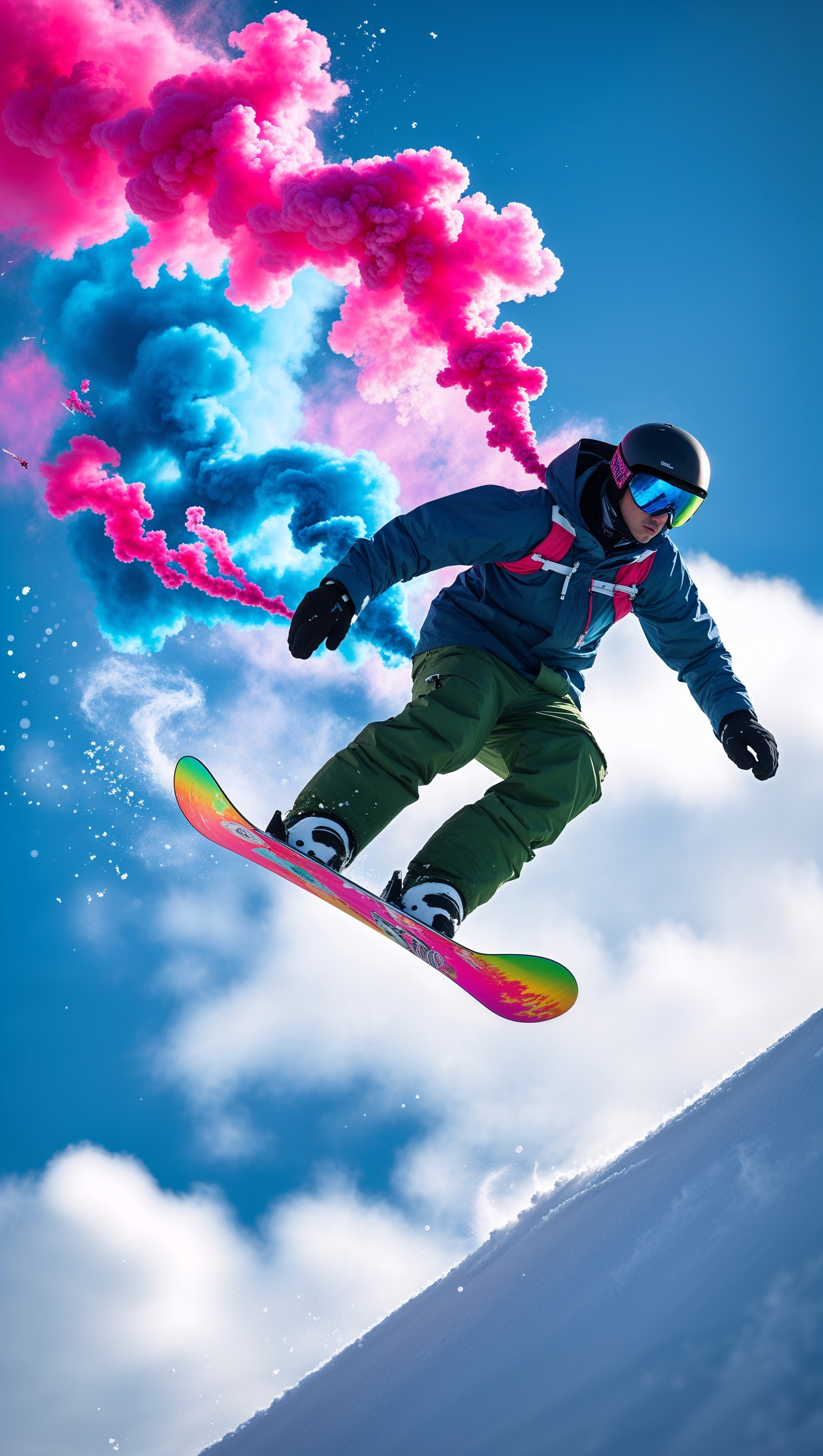 1664x2944 A snowboarder jumping with colorful smoke trails behind
