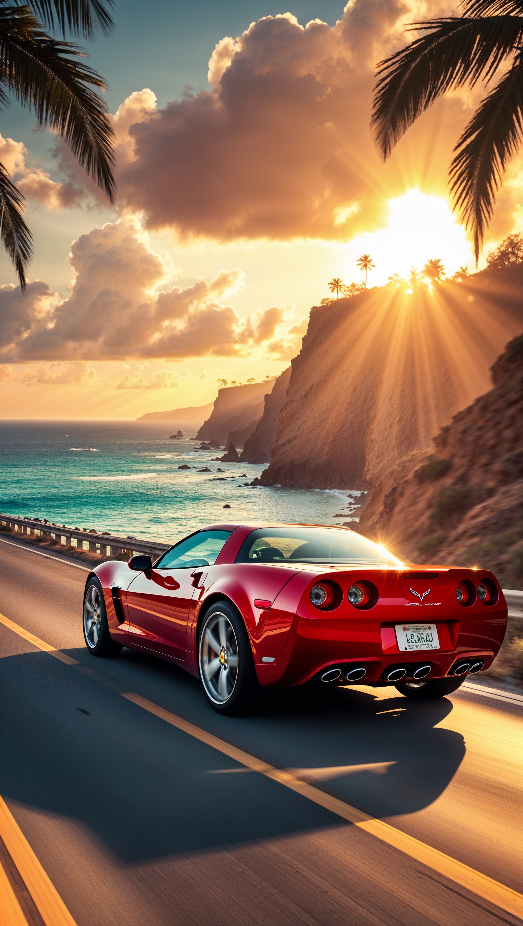 1664x2944 A red Corvette speeding on a coastal highway at sunset, iPhone wallpaper