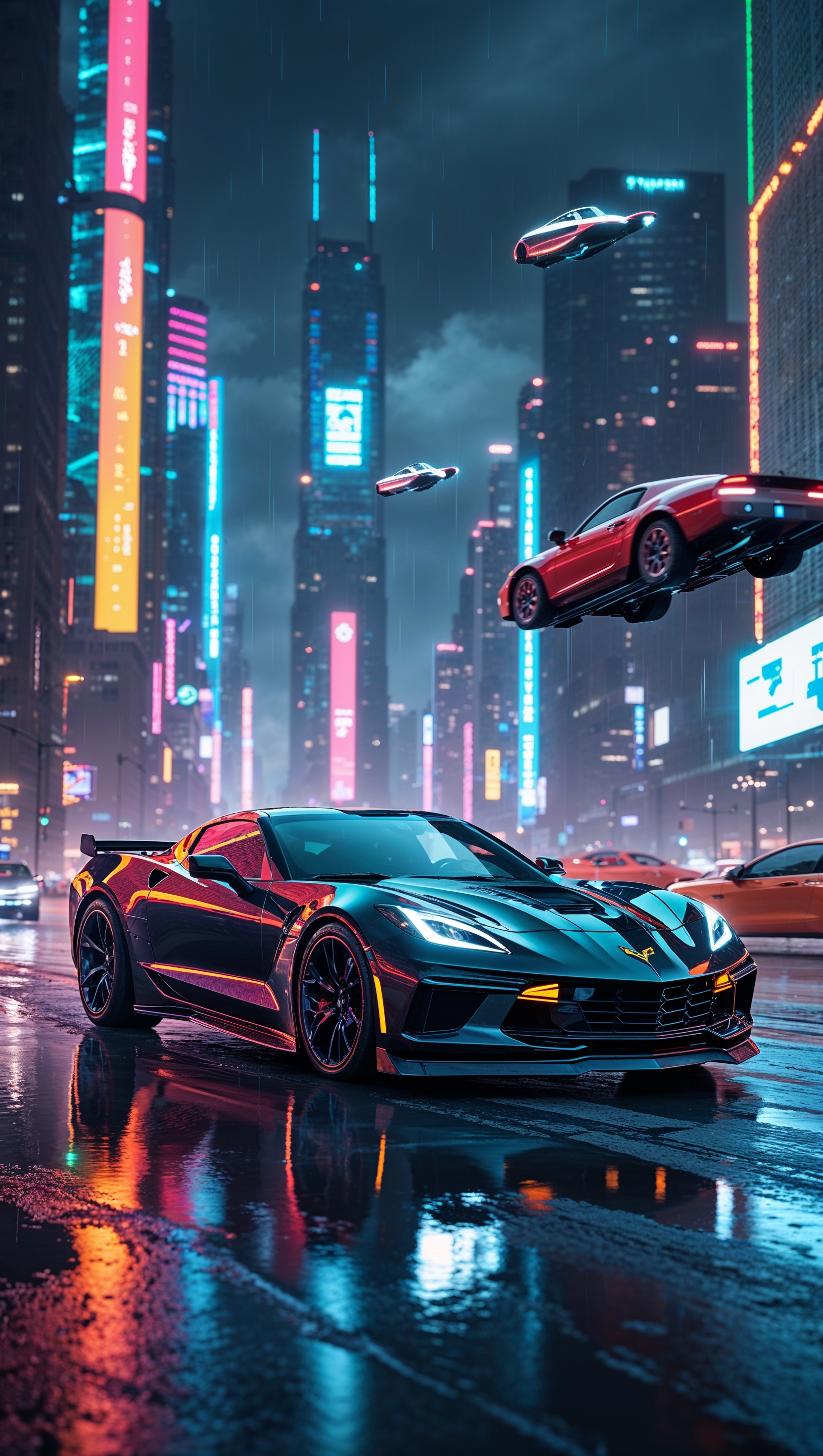 1664x2944 Corvette in a cyberpunk world, glowing streets and futuristic lights, iPhone wallpaper