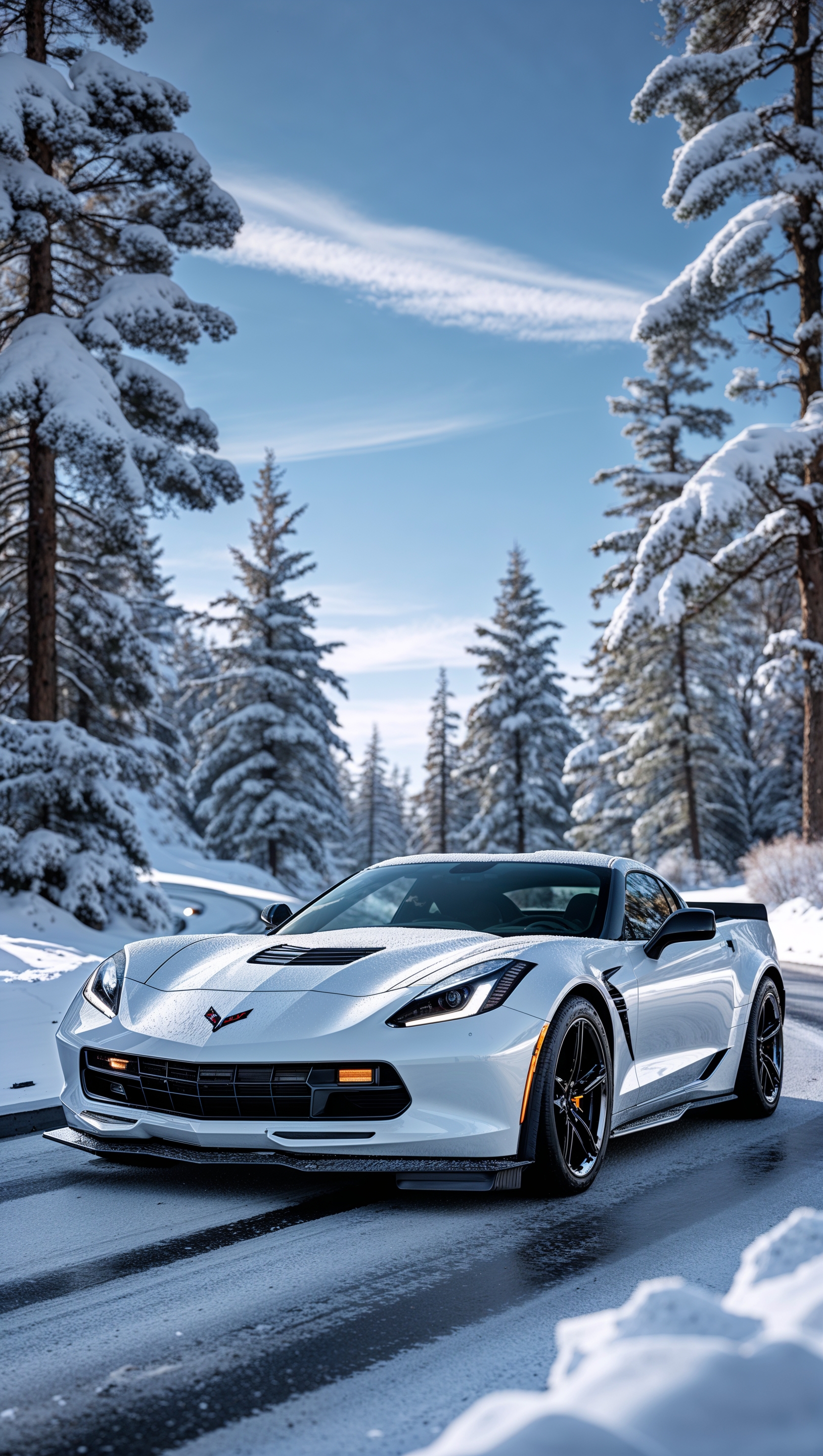 1664x2944 White Corvette in the snow with pine trees, winter iPhone wallpaper