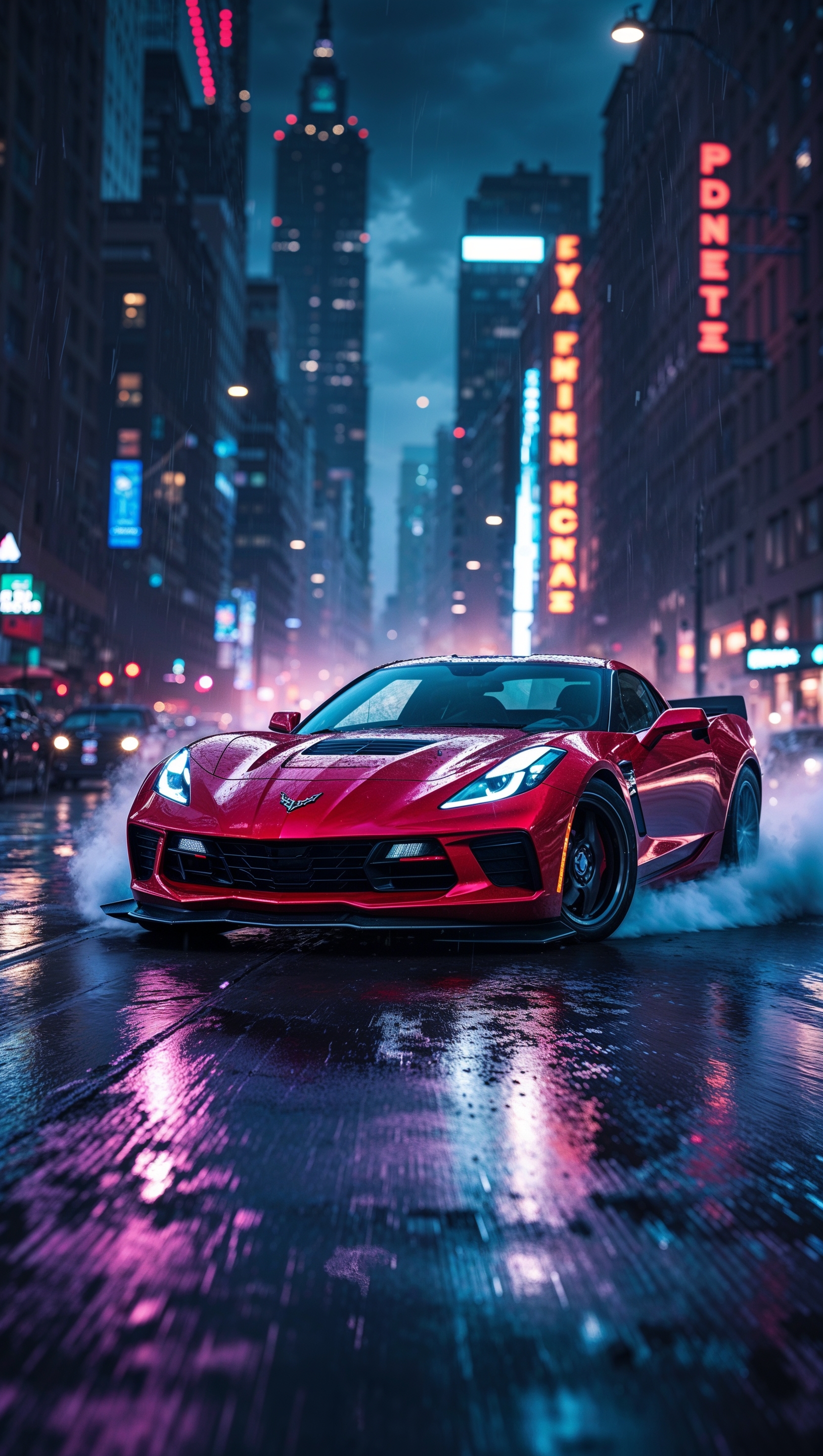 1664x2944 Corvette drifting on a wet city street at night, rain reflections, iPhone wallpaper