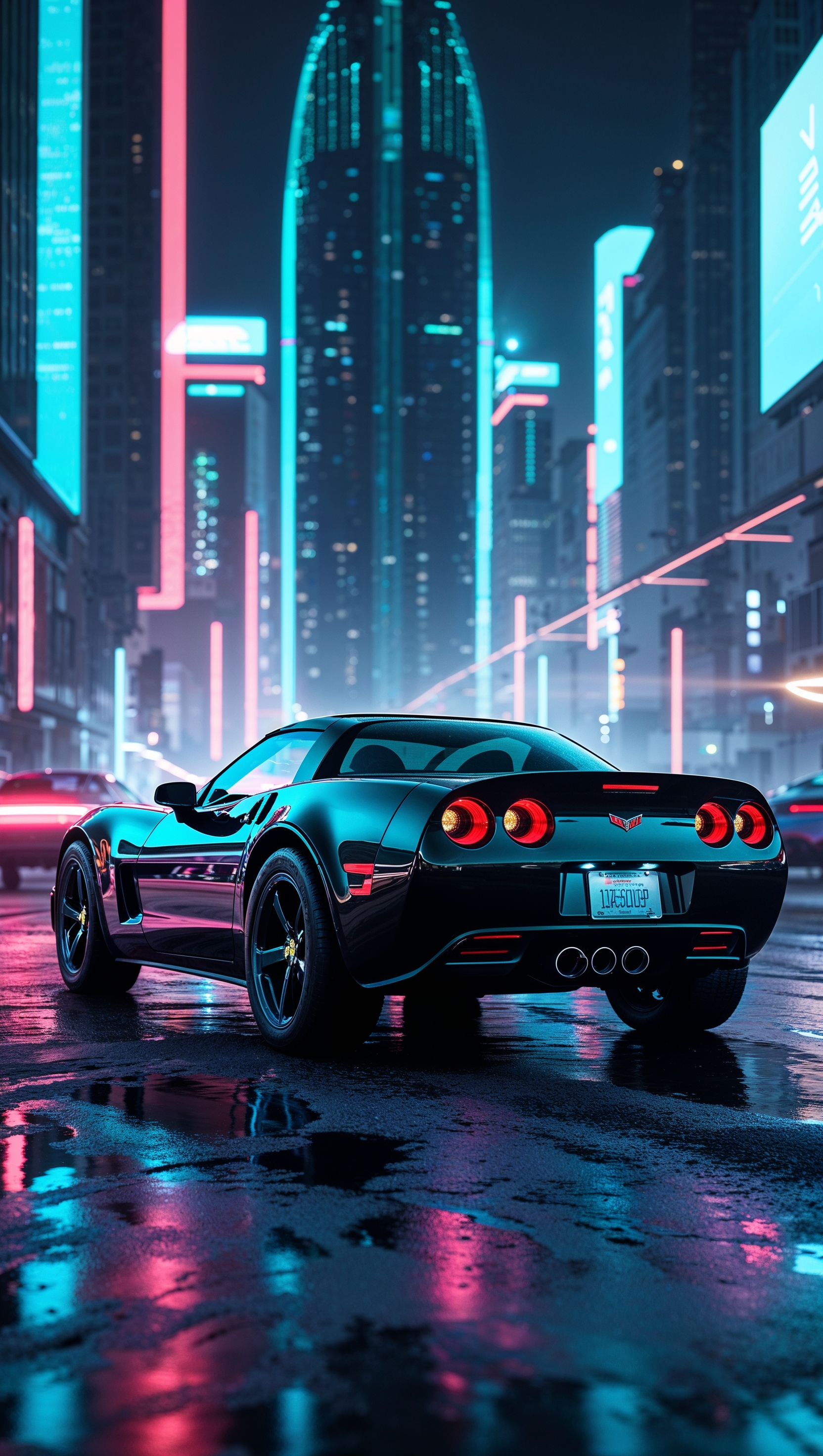 1664x2944 A black Corvette parked under neon lights in a futuristic city, iPhone wallpaper