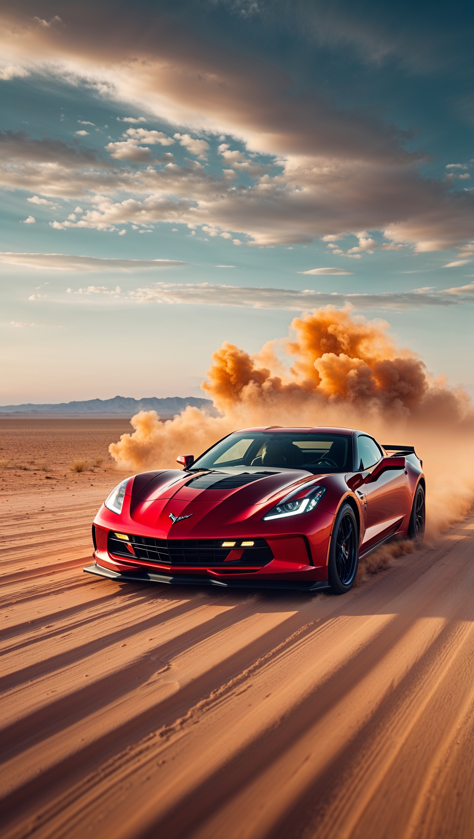1664x2944 Corvette racing through the desert with dust clouds, cinematic iPhone wallpaper