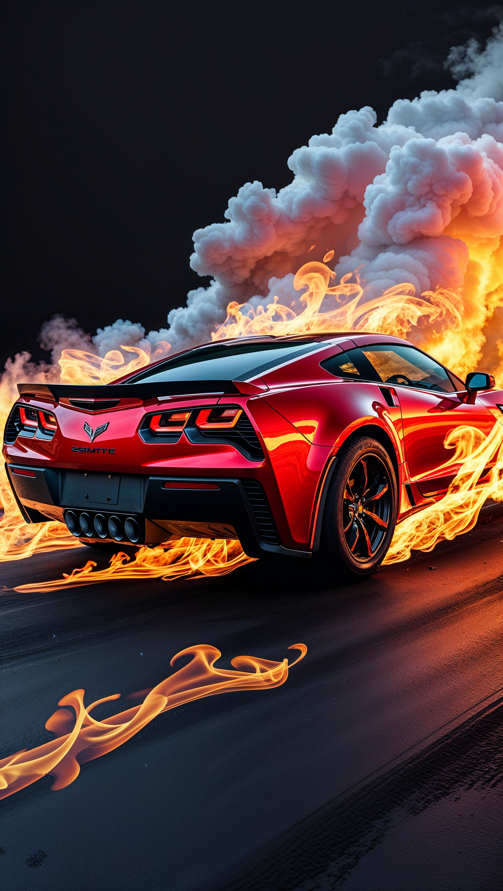 1664x2944 Red Corvette with flames and smoke, aggressive style iPhone wallpaper
