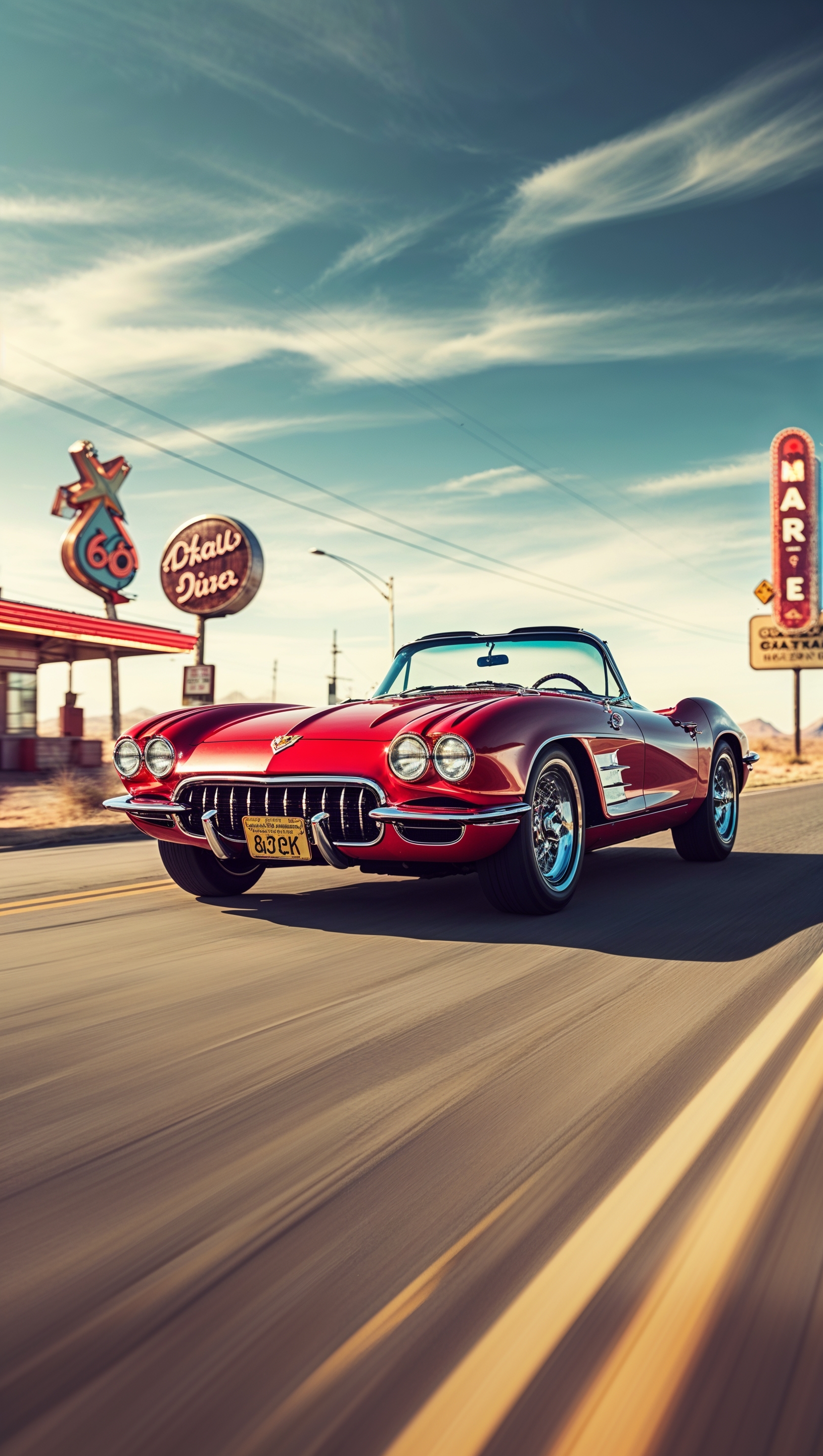 1664x2944 Corvette driving on Route 66, vintage road trip theme, iPhone wallpaper