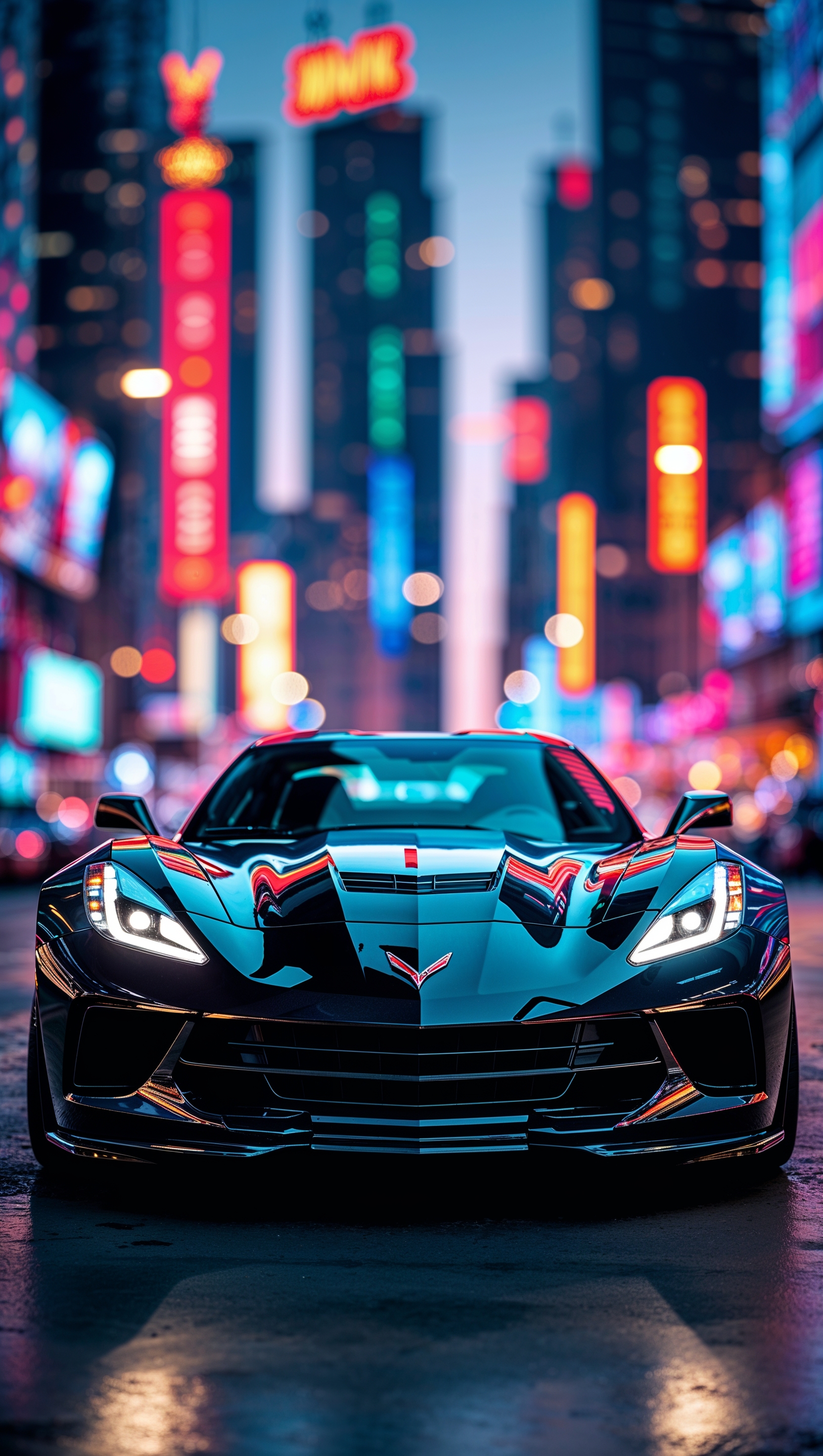 1664x2944 Corvette with chrome details reflecting the city lights, iPhone wallpaper