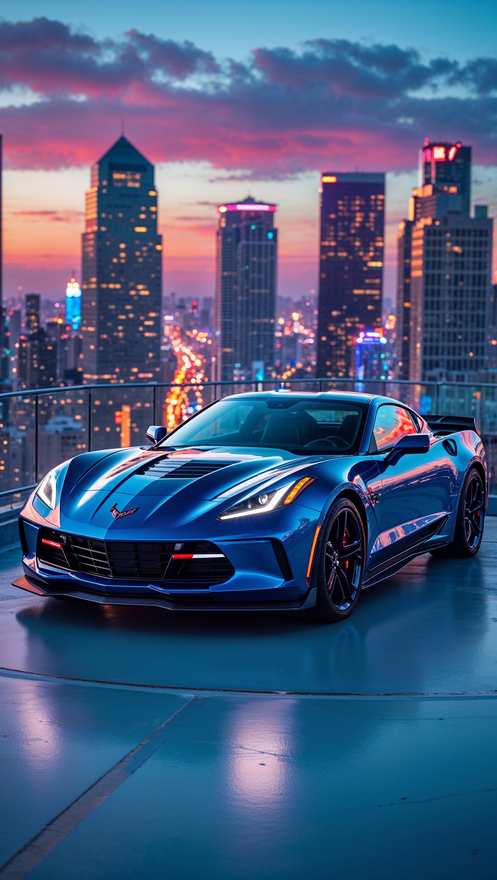 1664x2944 Corvette parked on a rooftop with city skyline in the background, iPhone wallpaper