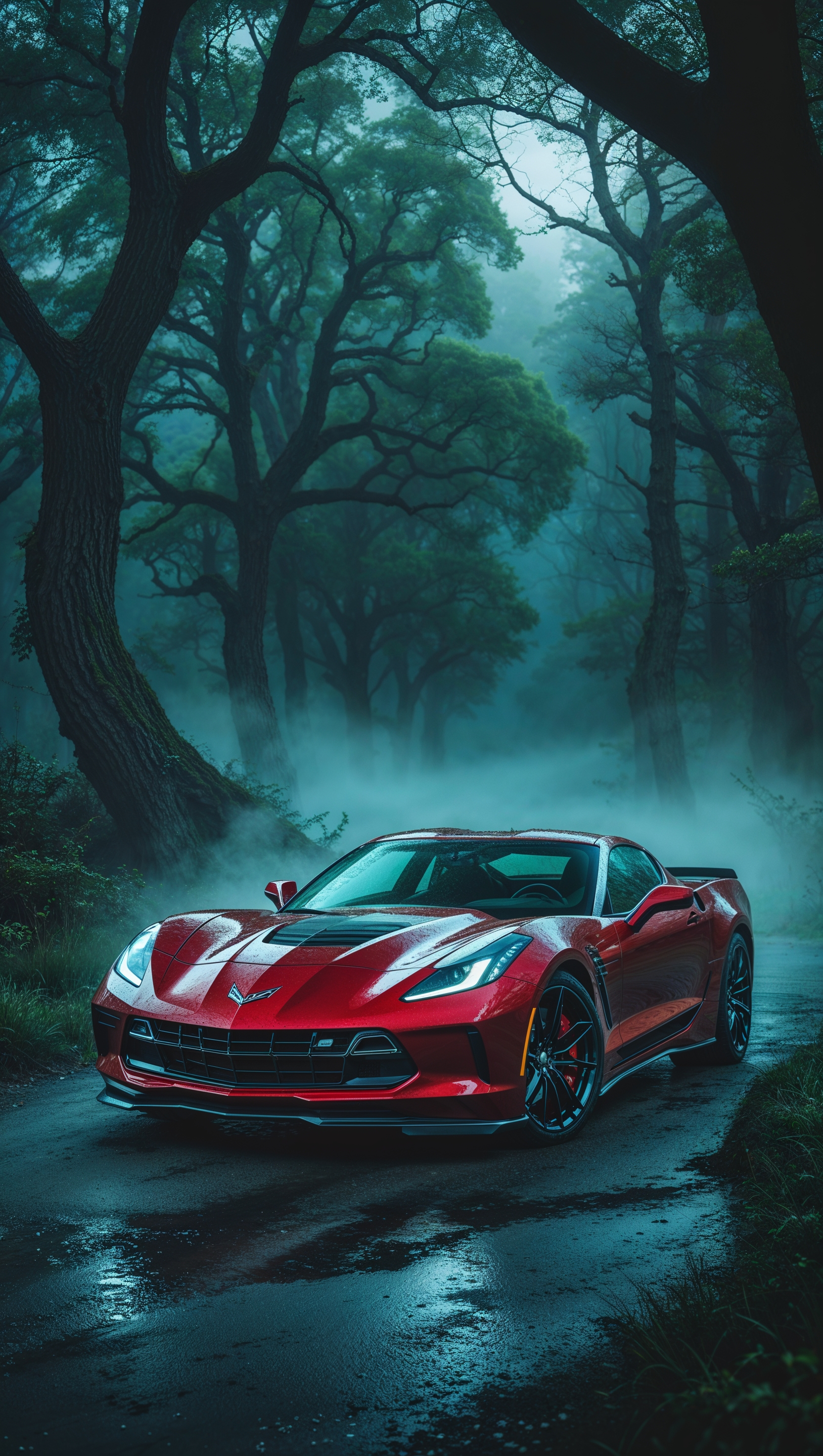 1664x2944 Corvette in a misty forest road at dawn, mysterious mood wallpaper for iPhone