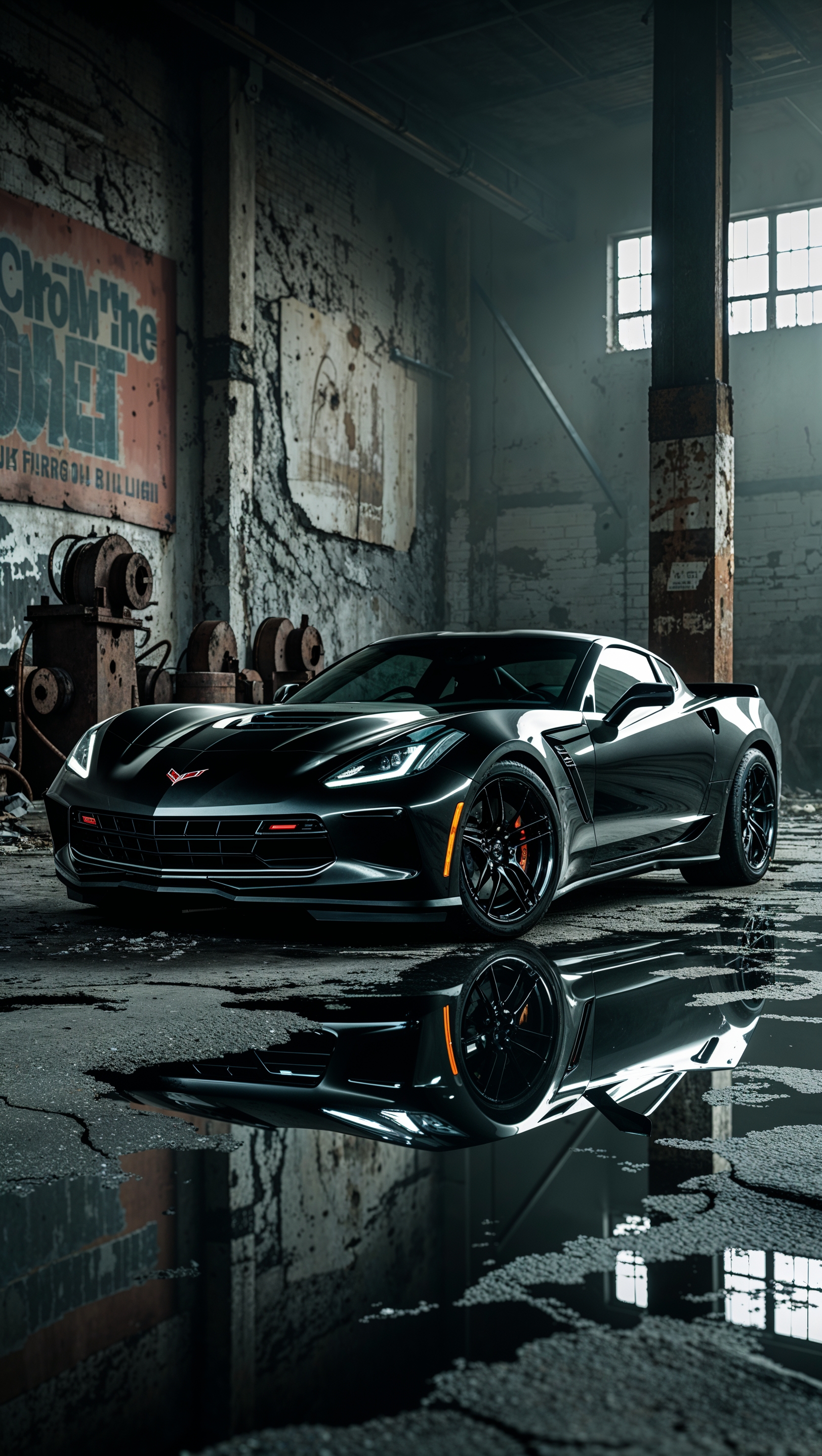 1664x2944 Corvette in an abandoned warehouse, gritty urban wallpaper for iPhone