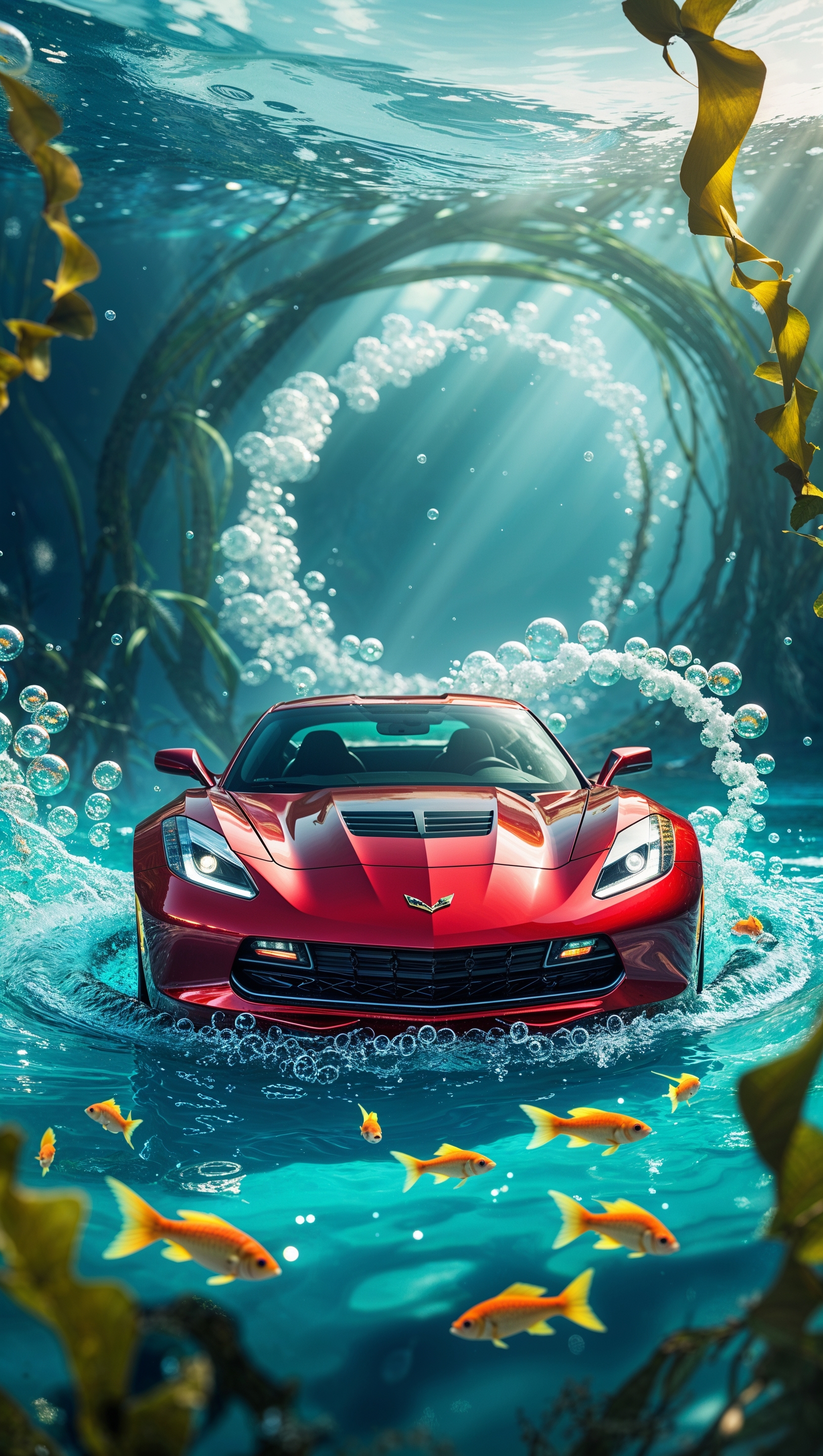 1664x2944 Corvette underwater with bubbles and fish, fantasy theme iPhone wallpaper