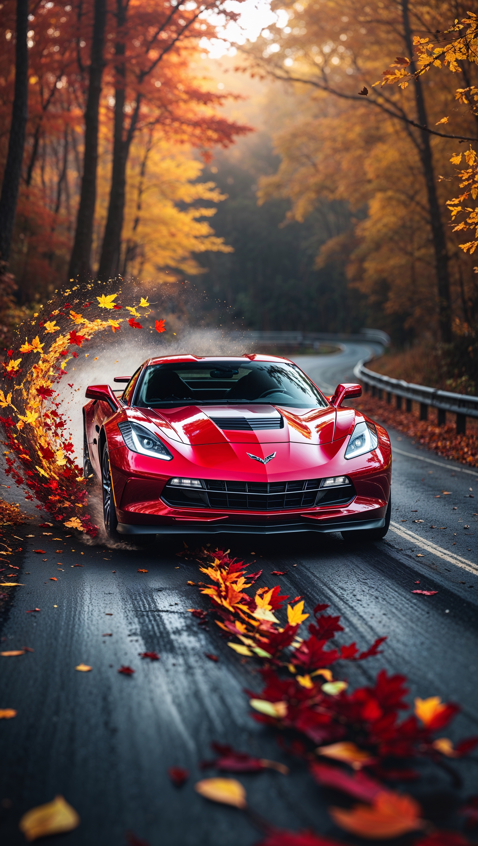 1664x2944 Corvette driving through autumn leaves on a forest road, seasonal iPhone wallpaper
