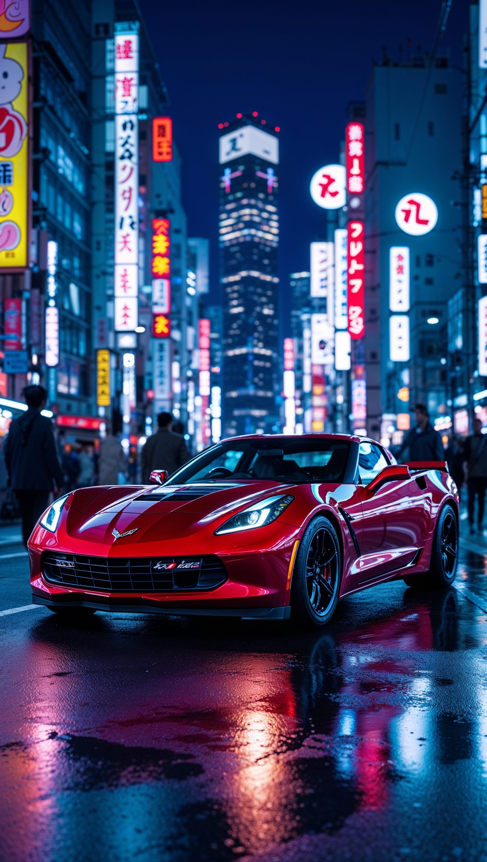 1664x2944 Corvette cruising in Tokyo streets at night, Japan urban iPhone wallpaper