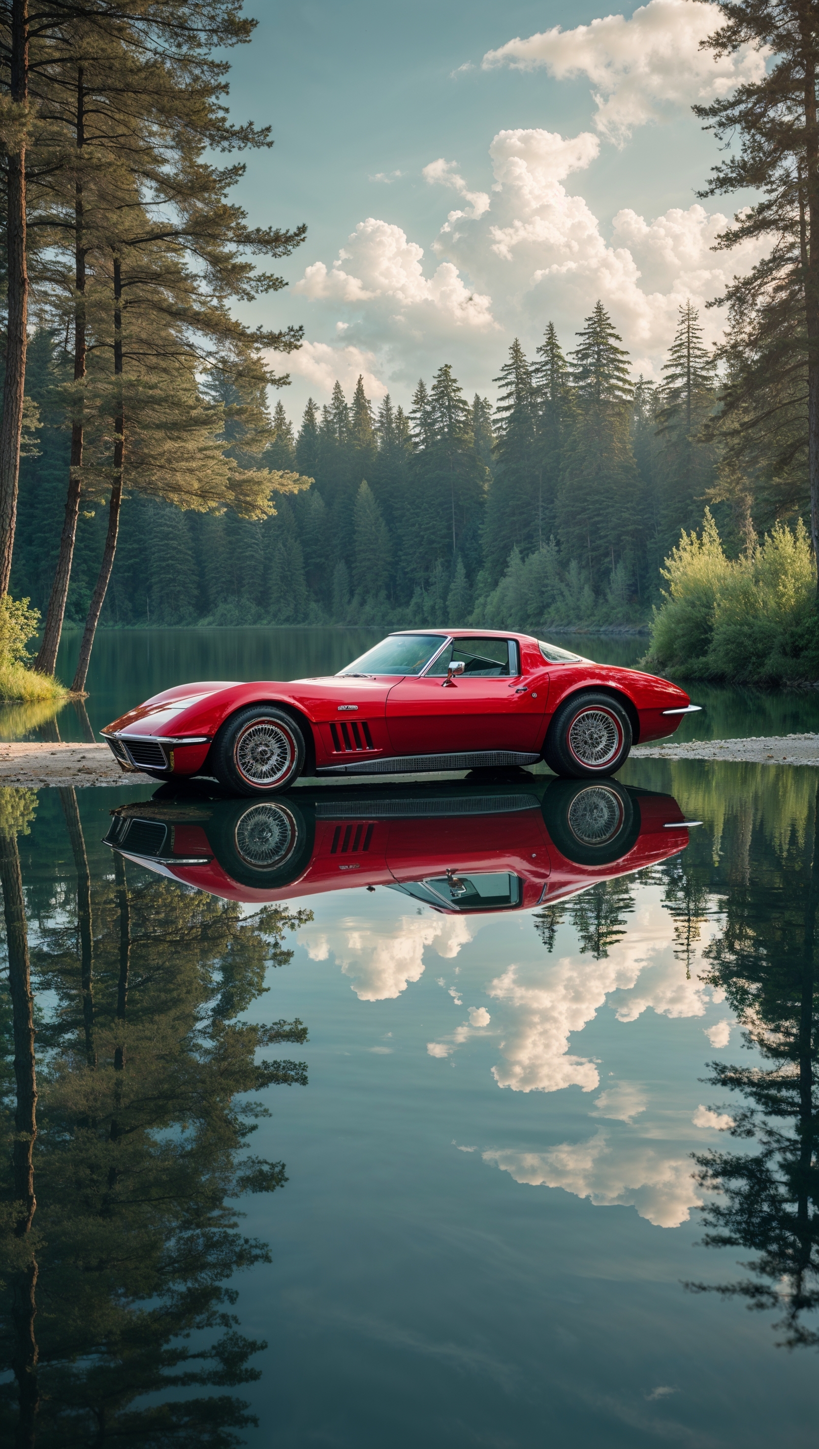 1664x2944 Corvette with a reflection on a calm lake, peaceful nature iPhone wallpaper