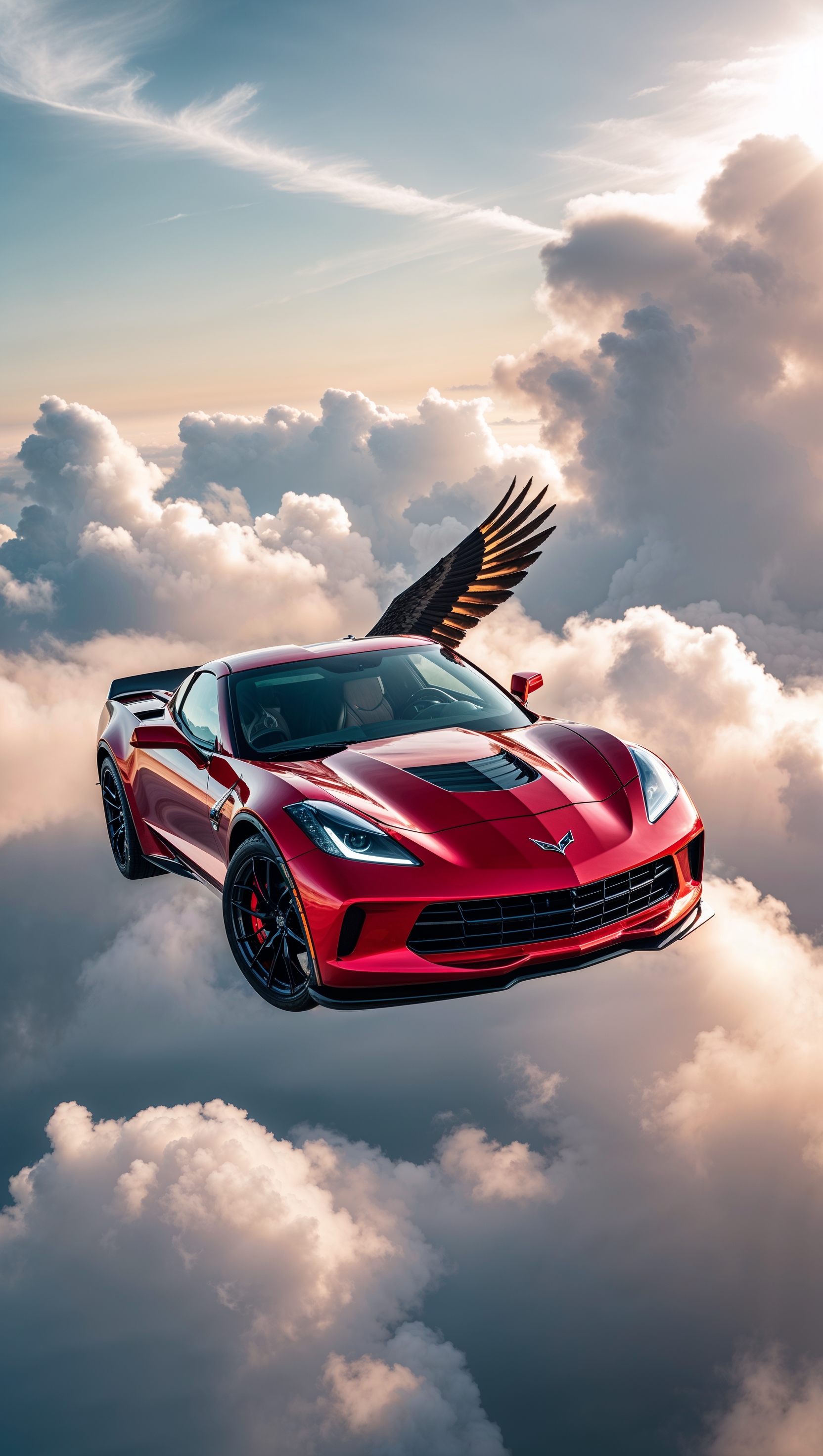 1664x2944 Corvette with wings flying above the clouds, fantasy dream iPhone wallpaper